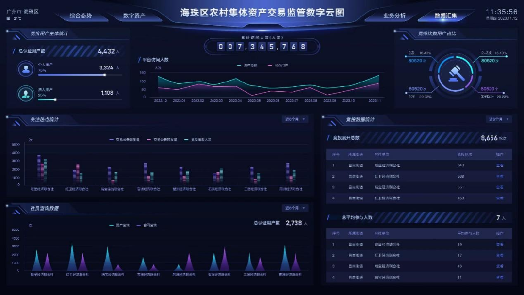 围绕“数字乡村,科技赋能”方向,平台创新利用“政府+国企+科企”模式,提升农村集体资产交易和监管体系;充分利用广州移动大数据、区块链、数字孪生等新一代信息技术,建设海珠区农村集体资产交易管理服务平台,为海珠区农村集体产权流转数字化建设提供强大的系统支撑和管理工具。