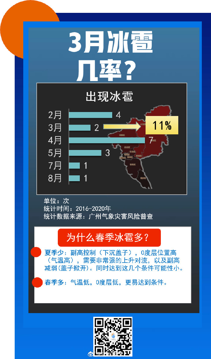 简单来说,本次冰雹的出现,就是强大的上升气流和丰富的水汽共同作用,使得水汽能够上升到足够的高度并通过滚雪球效应,最终凝结成冰雹。据历史资料统计,广州冰雹主要出现在2-10月,尤其集中在3-5月,频次高发区为北部地区,3月的出现的几率大概为11%。