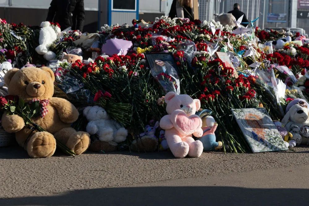这是3月28日在俄罗斯首都莫斯科近郊“克罗库斯城”音乐厅前拍摄的鲜花和玩具。新华社记者 白雪骐 摄