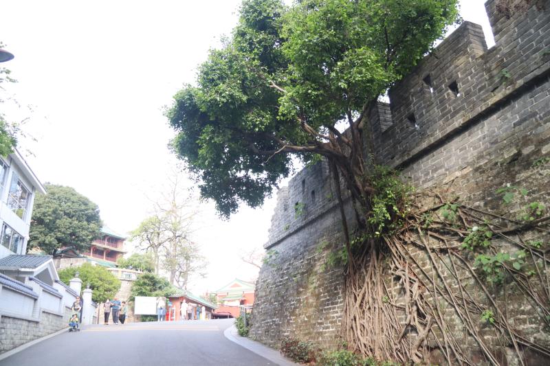 沿镇海路前行,可以欣赏硕大繁盛、盘根错节的树根与城墙融为一体的奇特景观。“越秀山明城墙有一个明显的特点,就是城墙上攀爬着盘根错节的榕树根。历经多年生长,榕树根早已深深扎入城墙,与城墙融为一体。”越秀公园讲解员蓝玲玲介绍。据了解,越秀公园发布的主题曲《越秀增辉》有一句歌词:“看那古城墙缠绕着树藤,多像忠诚的人拥护这座城”,描述的便是老榕树和古城墙相依相伴的场景。