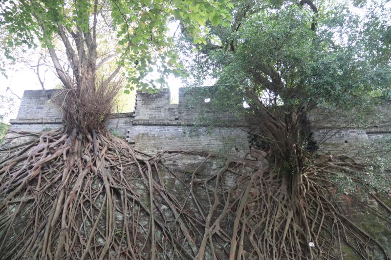 古城墙依山蜿蜒,老榕树树根融入城墙