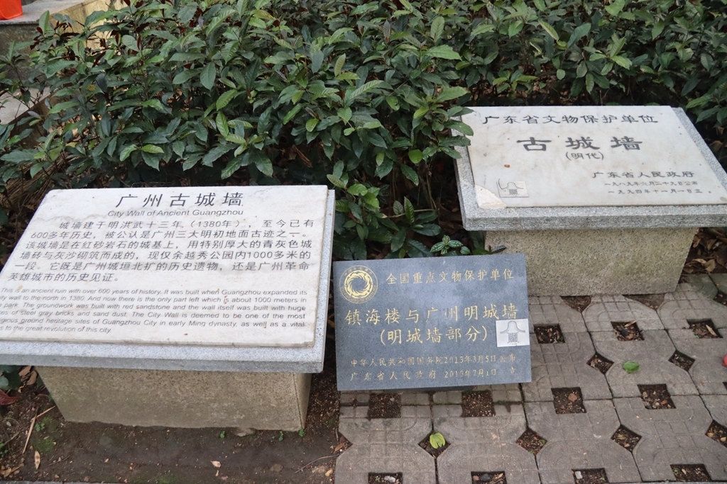 明代教育家、文学家黄佐在《广东通志》中记载,当时广州城“周长三千七百九十六丈、高二丈八尺”,有城门、城楼、敌楼、警铺等。“崇祯十三年(1640年)增筑北城,将城墙培高七尺,增厚墙基,并且每隔二十丈置有台阶”。1918年,广州城内大多数城墙和城门楼被拆,明城墙仅存越秀公园内的一段。城墙用青灰色大砖砌筑,红砂岩石块砌基,现存总长度1137米。除镇海楼外的古城墙保存相对完整外,其余只剩下高度不等的残垣。1987年,镇海楼后面连同东、西两侧的城墙修缮复原,长180米,雉堞严整,恢复旧观。除镇海楼侧的城墙外,镇海路上还有一段长1000米左右的城墙也于2011年进行了全面修缮。2013年,镇海楼与广州明城墙被列为第七批全国重点文物保护单位。