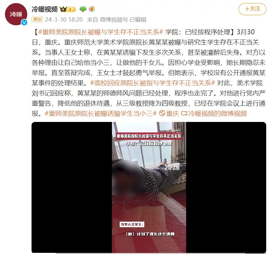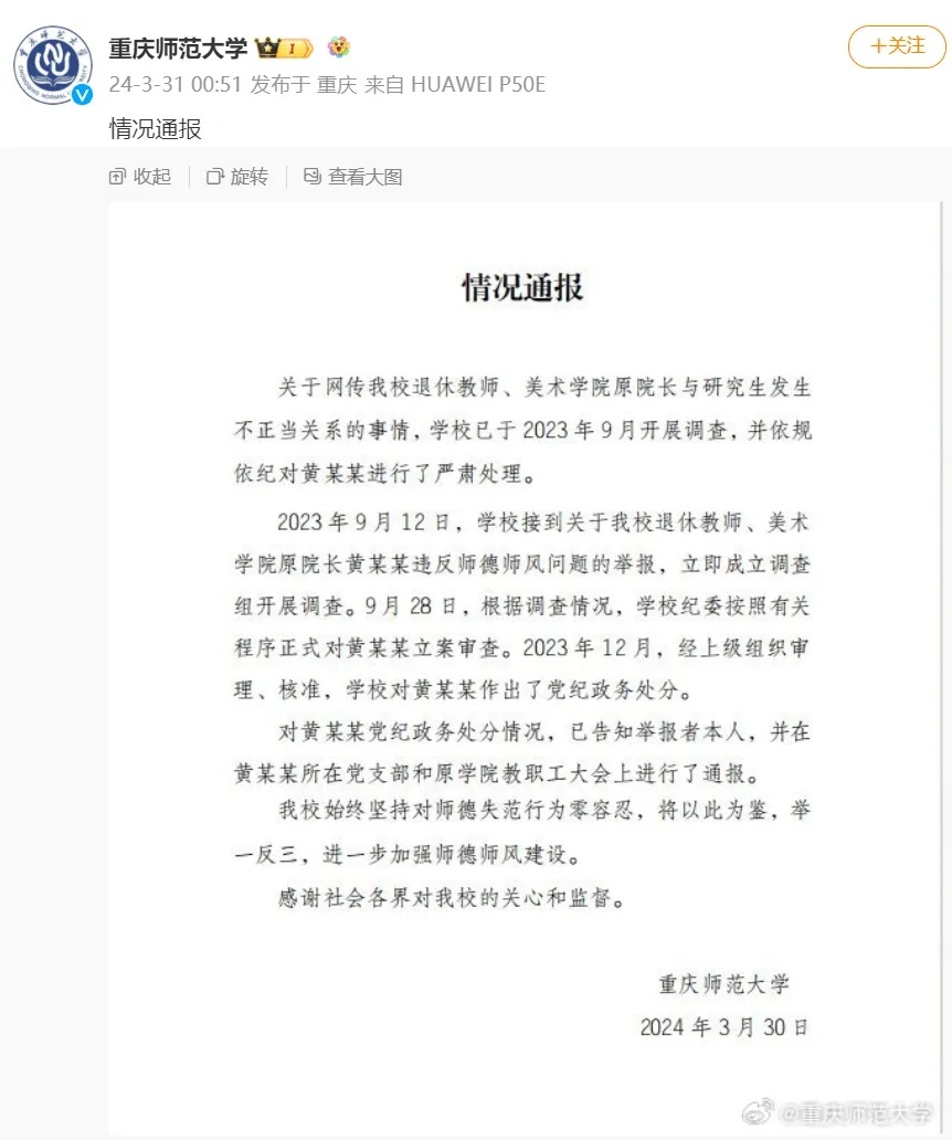 重庆师范大学通报“美院原院长与研究生发生不正当关系”:关于网传该校退休教师、美术学院原院长与研究生发生不正当关系的事情,学校已于2023年9月开展调查,并依规依纪对黄某某进行了严肃处理。