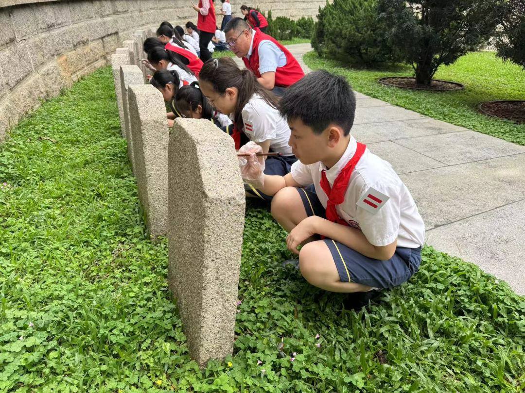参加描红的志愿者们怀着对英烈的缅怀和敬仰,仔细擦拭墓碑上的尘土、调试描红颜料、一笔一划耐心地对烈士纪念碑上风化褪色的铭文碑文进行描摹填漆。天气炎热,志愿者们尽管汗流浃背,但丝毫不影响他们专注地描摹好每一个细节。每一笔的字体勾勒,都是一次精神洗礼。一笔一划尽显崇敬,一竖一横皆是传承。最后,大家为每一座墓棺、每一块墓碑献上鲜花,表达对英雄烈士崇高的敬意。