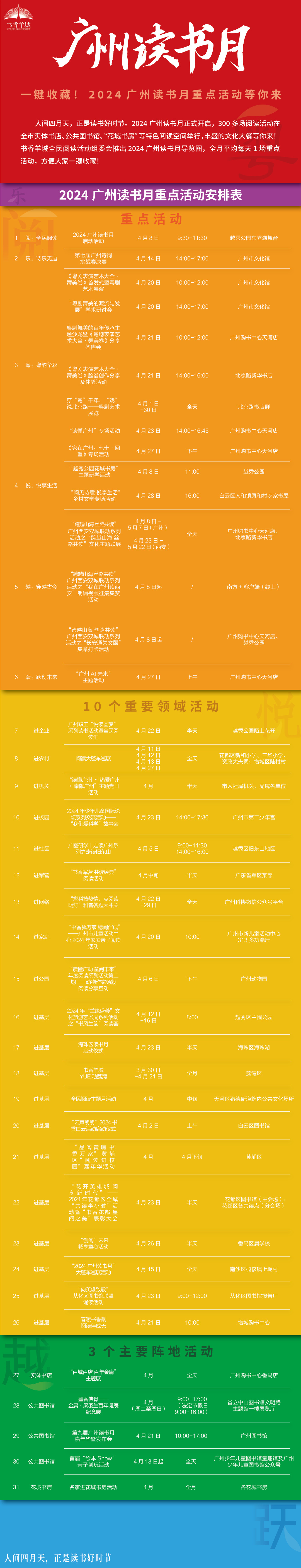 作为一座崇文重教的城市,广州自古以来守护文脉,向上生长。为深化书香羊城全民阅读活动,扎实推进“阅读之城”建设,2024年4月,由书香羊城全民阅读活动组委会指导,中共广州市委宣传部、广州市新闻出版局、广州新华出版发行集团主办的2024广州读书月系列活动即将启动。