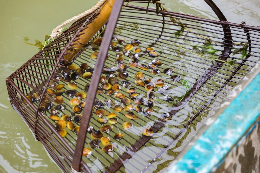 清晨是捞蚬最好的时间,捞蚬用的是当地人祖祖辈辈流传下来的一种特制工具——蚬拖,可以把它看成一个大号的摩托车篮,连着杆子和杠绳。捞蚬时,船身顺着水流打横漂着,沿前进方向放下挡水拖耙,蚬拖则在反方向斜45°插入水底沙层。船慢慢漂着,河沙带蚬被“犁”入蚬拖,沙子渐渐漏去,一身甲壳的小东西却被挡在格栅里。