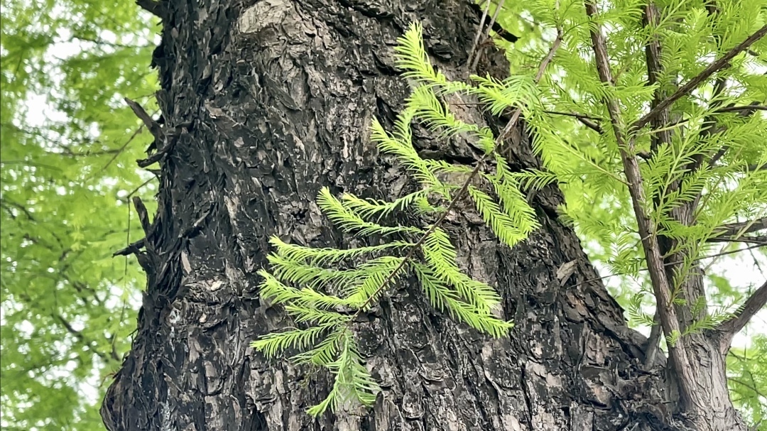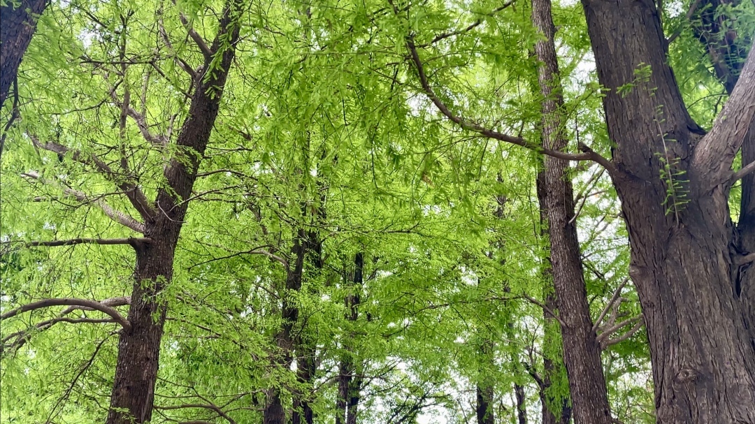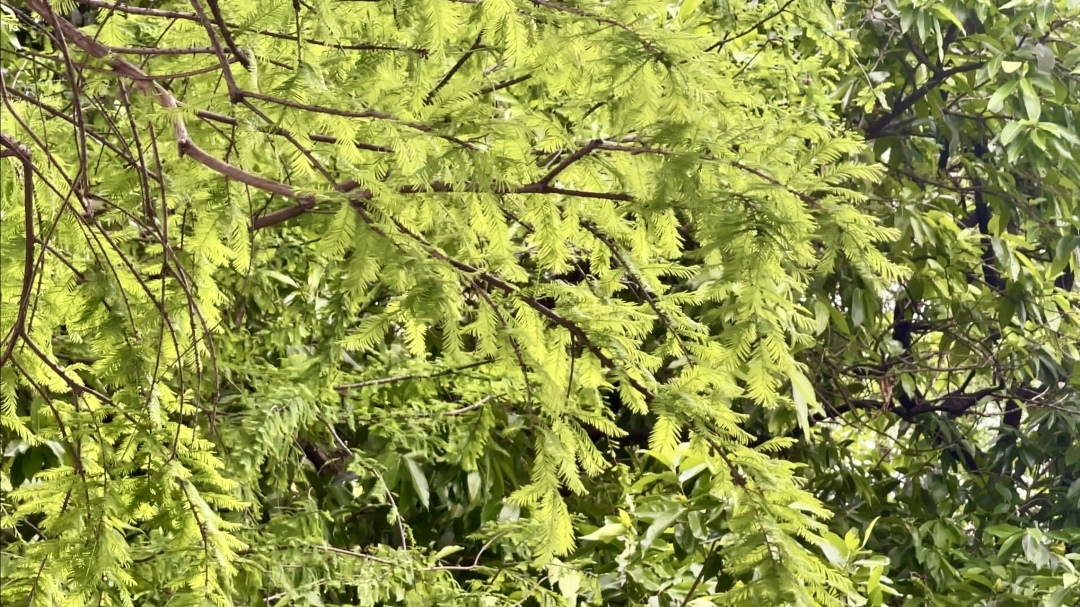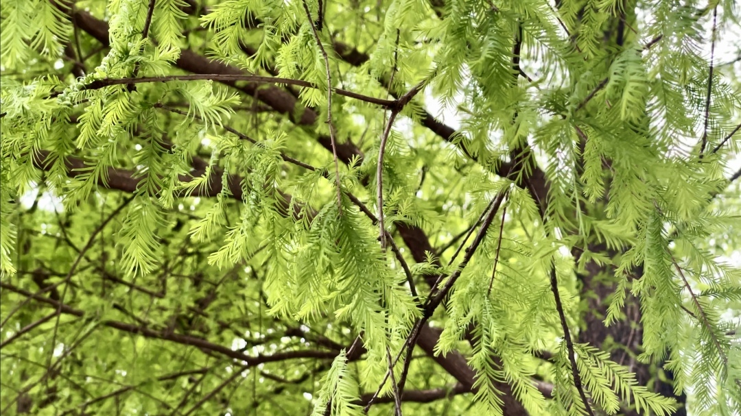 与夏天的浓绿葱翠、秋天的黄绿相间不同,春天的落羽杉稚嫩新绿,柔美的色彩如同油画一般鲜活,同时在深浅之间又存在着层次之美。倘若有微风拂过,柔软娇嫩的羽毛状复叶在河岸边轻轻摇曳,似天使的羽翼,更似江南的垂柳。