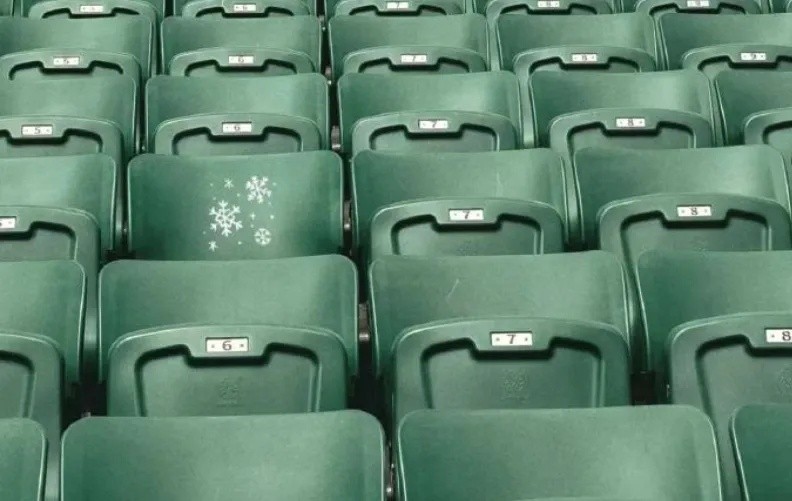4月3日,北京工体绿色的看台上,一张座椅被喷涂了几朵洁白的雪花。