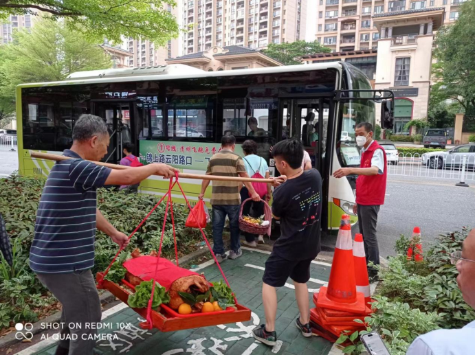 市民携鲜花、烧猪等祭扫品搭乘免费公交