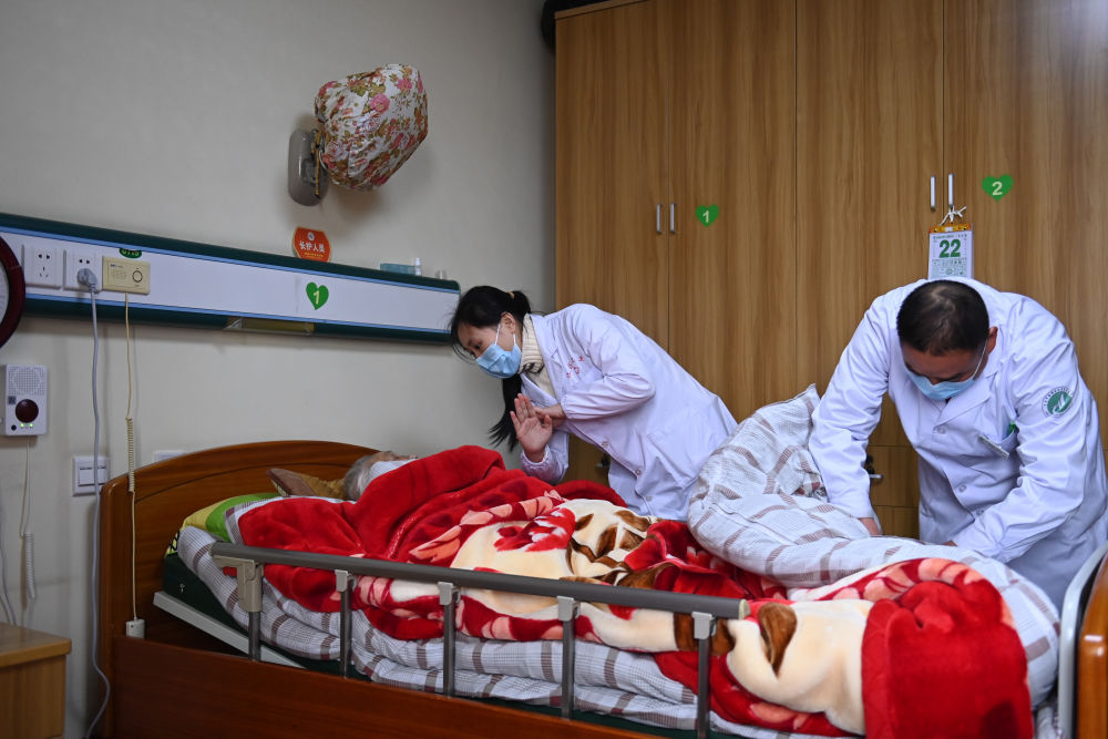 在宁波市镇海区金生怡养院,医护人员为一位失能老人提供护理服务。新华社记者黄宗治 摄