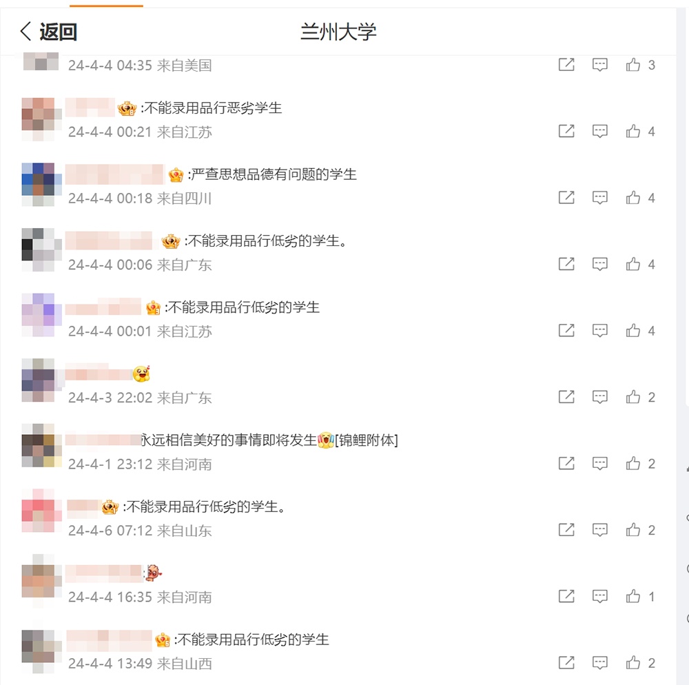 另外,在兰州大学官微留言中,从3日开始已经几乎被众多网友“洗版”“刷屏”。多数网友希望兰州大学方面采取慎重态度,有网友留言“不能录用品行恶劣学生”“德智体,德在第一”。