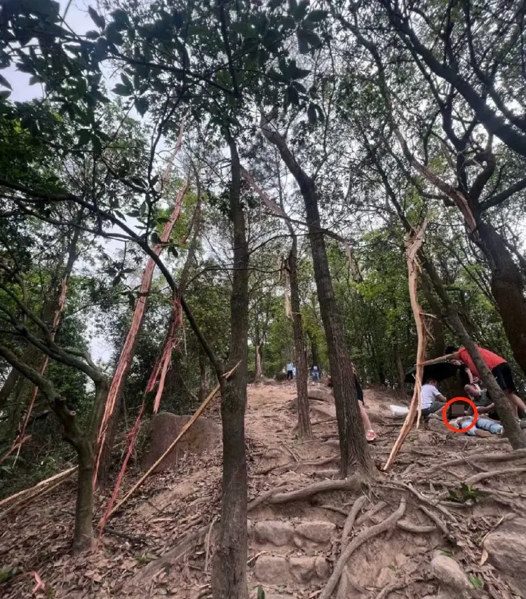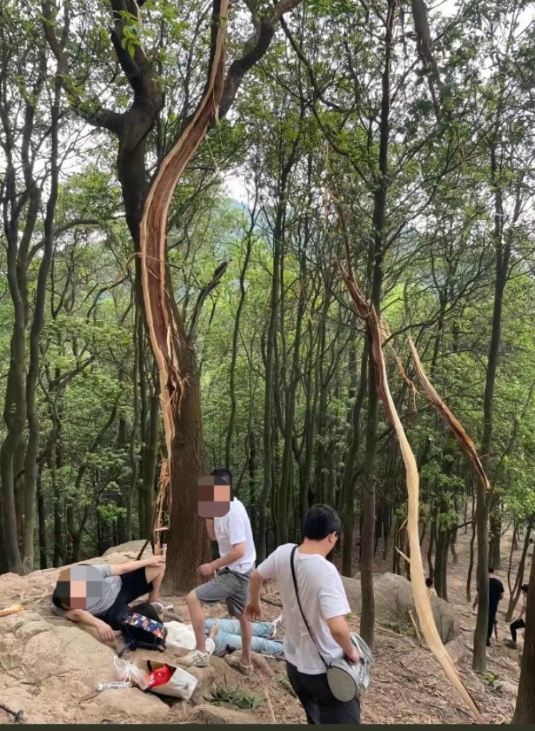 4月5日清明节,广东中山市多名小红书博主发帖称,下午去爬狮头山途经一处树林时有人遭遇雷击受伤。上游新闻记者从网友陈先生(化名)提供的视频看到,在攀爬路上有一片树林,多棵大树被劈开,一女子躺地上。
