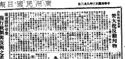 在那些年,开展抗日救亡宣传工作往往会遇到被打压乃至更危险的境遇。图为广州民国日报刊登“焚大批反动刊物”的报道。(来源:血染青春放光华——纪念广州“文总”六烈士牺牲90周年展览)