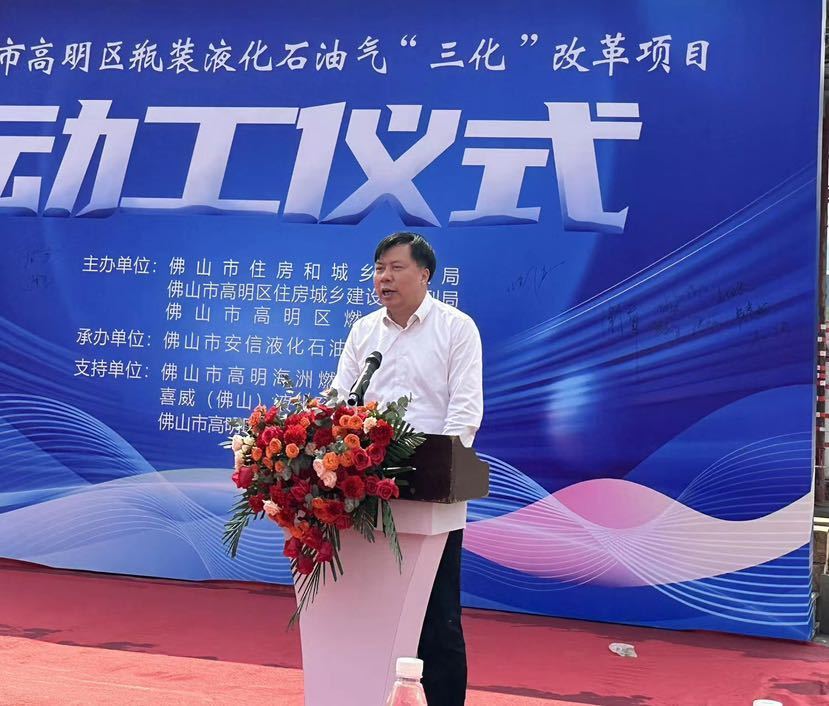 张伍副局长在启动仪式上致辞并指出,“三化”改革工作是佛山市加强瓶装液化石油气行业管理,建立健全安全监管长效机制的具体措施;是全面整顿瓶装液化石油气市场秩序,促进行业集约化发展和提升行业本质安全的重要手段。经过两年多的时间,佛山市“三化”改革工作进展顺利,开展了配送电动三轮车、松岗供应中转站启动工作,取得了一个又一个成果。顺德区、高明区积极牵头统筹燃气企业整合工作,在全市率先成立合资公司、启动充装站升级改造,是我市瓶装液化石油气行业“三化”改革又一个重要的成效,意义非凡。同时,要求各燃气经营企业要绷紧安全这根弦、守护万家“烟火气”,坚持人民至上、生命至上,以“时时放心不下”的责任感和认真负责的担当精神,毫不松懈做好城镇燃气安全生产工作,为全市居民提供“安全气、便宜气”。