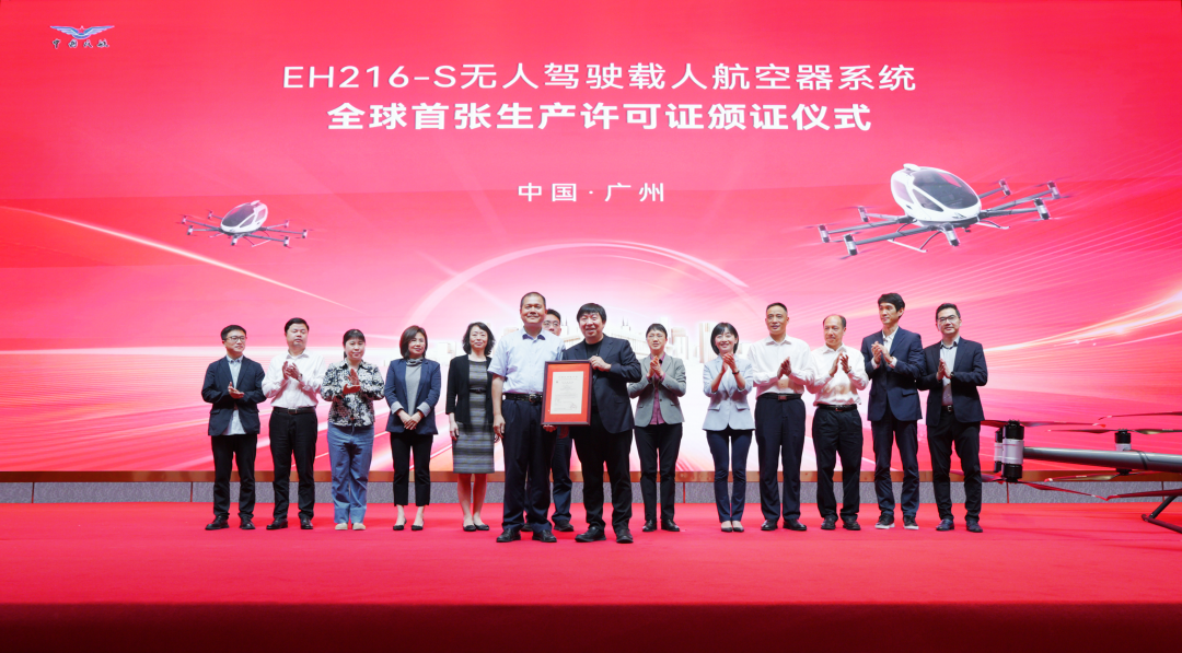 4月7日,中国民航局在广州正式向亿航智能颁发EH216-S无人驾驶载人航空器系统生产许可证(Production Certificate, PC),这也是全球eVTOL行业内首张生产许可证,是自EH216-S成功取得型号合格证(TC)、标准适航证(AC)之后的又一重要里程碑,标志着EH216-S率先迈入规模化生产阶段。