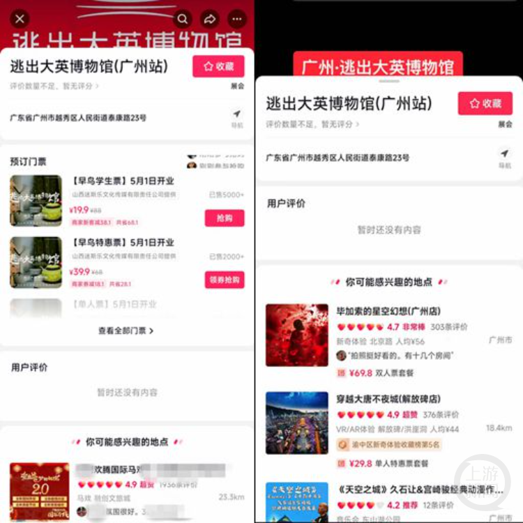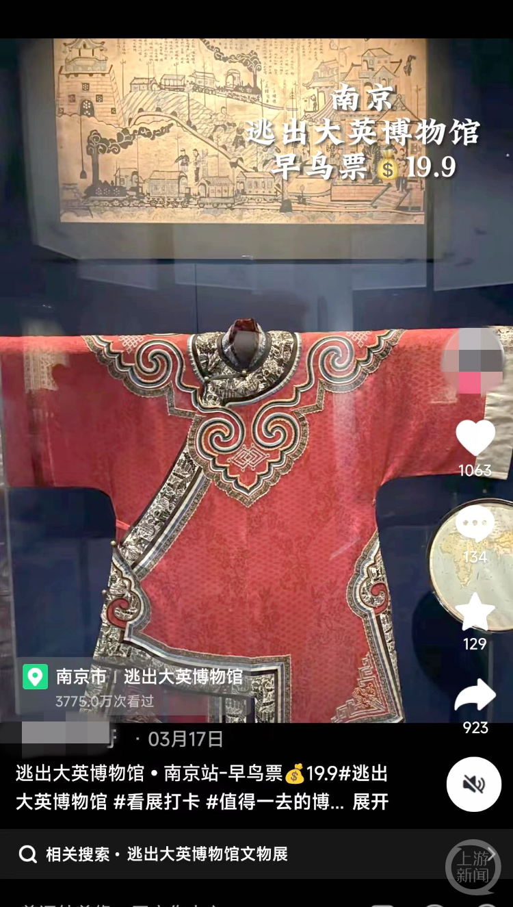 7日上午,记者在抖音平台上看到,“逃出大英博物馆”展在该平台有多个门票销售链接,展览地点涉及武汉、广州、南京、杭州等地。其中武汉展览已于4月4日开幕,其余几个地方都是5月1日才开始。