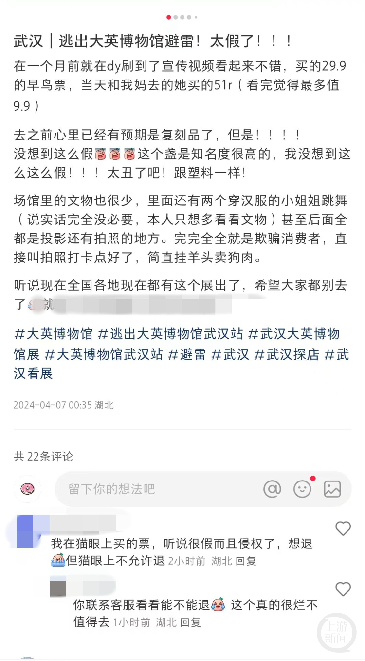 这个名为“逃出大英博物馆”的展览最早于4月4日在武汉开展。记者发现,网上出现多起对其的负面评价,认为这个展览“水”“蹭热度”“没啥可看的”“垃圾”……
