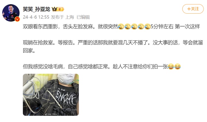 4月6日,他发微博称“双眼看东西重影,舌头左脸发麻,5分钟左右一次”,还进了医院抢救室。