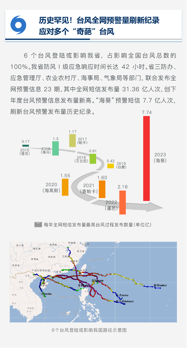 6个台风登陆或影响我省,占影响全国台风总数的100%。我省防风Ⅰ级应急响应时间长达42小时。省三防办、应急管理厅、农业农村厅、海事局、气象局等部门,联合发布全网预警信息23期,其中全网短信发布量31.36亿人次,创下年度台风预警信息发布量新高。“海葵”预警短信7.7亿人次,刷新台风预警发布量历史纪录。