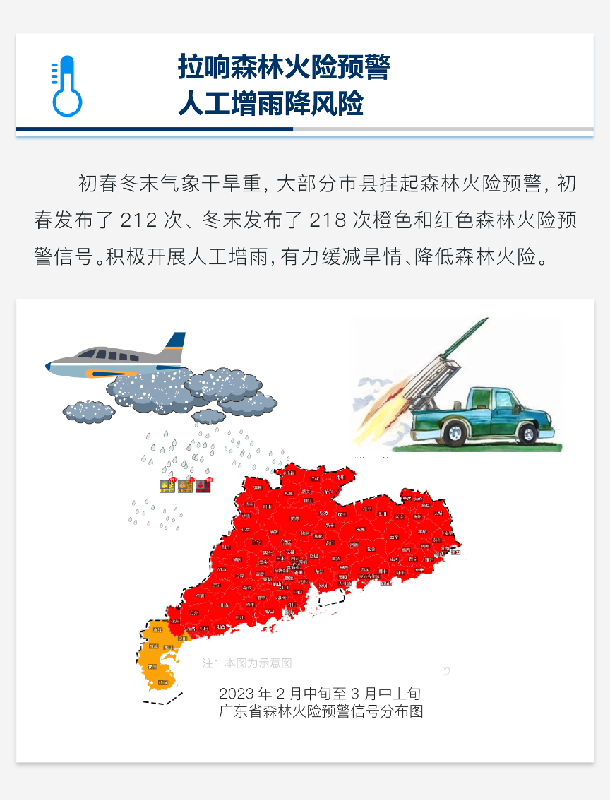 初春冬末气象干旱重,大部分市县挂起森林火险预警,初春发布了212次、冬末发布了218次橙色和红色森林火险预警信号。积极开展人工增雨,有力缓解旱情、降低森林火险。