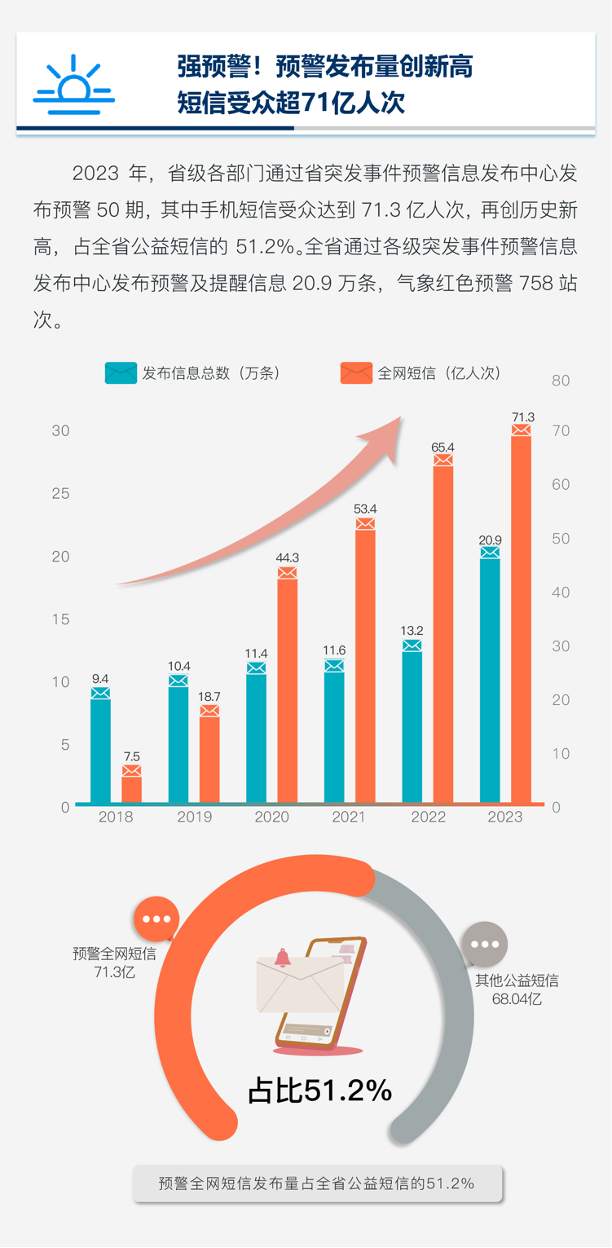 2023年,省级各部门通过省突发事件预警信息发布中心发布预警50期,其中手机短信受众达到71.3亿人次,再创历史新高,占全省公益短信的51.2%。全省通过各级突发事件预警信息发布中心发布预警及提醒信息20.9万条,气象红色预警758站次。