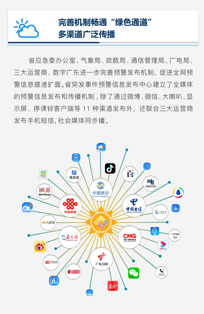 省应急委办公室、气象局、政数局、通信管理局、广电局、三大运营商、数字广东进一步完善预警发布机制,促进全网预警信息提速扩面。省突发事件预警信息发布中心建立了全媒体的预警信息发布和传播机制,除了通过大喇叭、显示屏、停课铃客户端等11种渠道发布外,还联合三大运营商发布手机短信,社会媒体同步播。