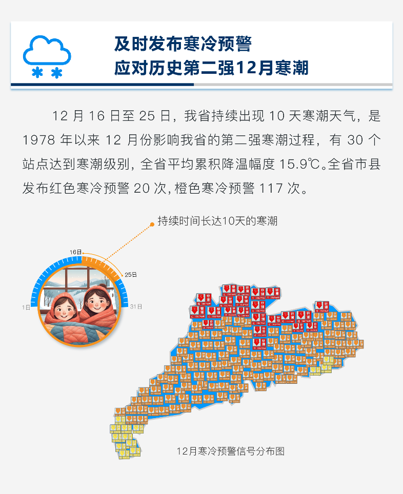 12月16日至25日,我省持续出现10天寒潮天气,是1978年以来12月份影响我省的第二强寒潮过程,有30个站点达到寒潮级别,全省平均累积降温幅度15.9℃。全省市县发布红色寒冷预警20 次,橙色寒冷预警117次。