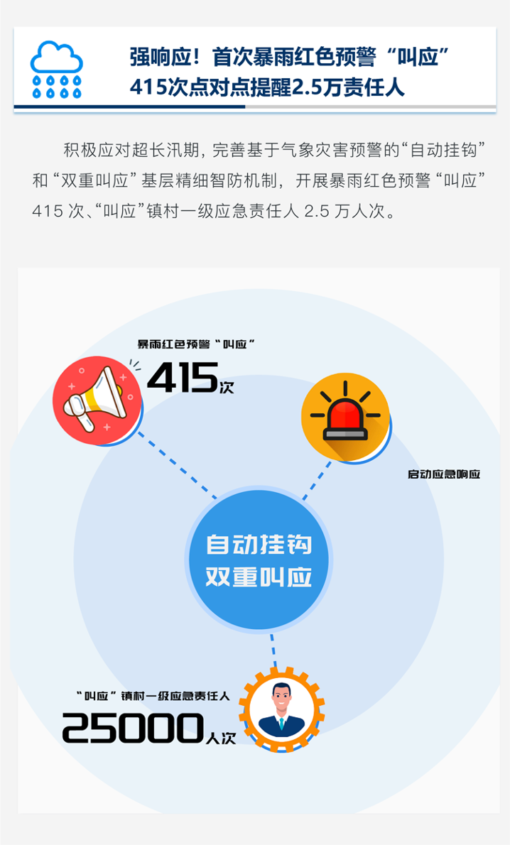 积极应对超长汛期,完善基于气象灾害预警的“自动挂钩”和“双重叫应”基层精细智防机制,开展暴雨红色预警“叫应”415次、“叫应”镇村一级应急责任人2.5万人次。