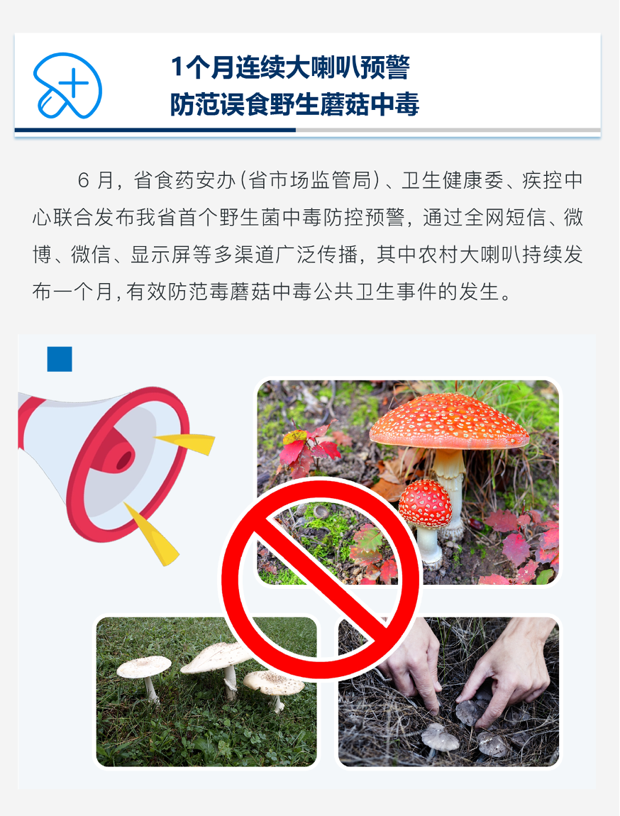 6月,省食药安办(省市场监管局)、卫生健康委、疾控中心联合发布我省首个野生菌中毒防控预警,通过全网短信、微博、微信、显示屏等多渠道广泛传播,其中农村大喇叭持续发布一个月,有效防范毒蘑菇中毒公共卫生事件的发生。