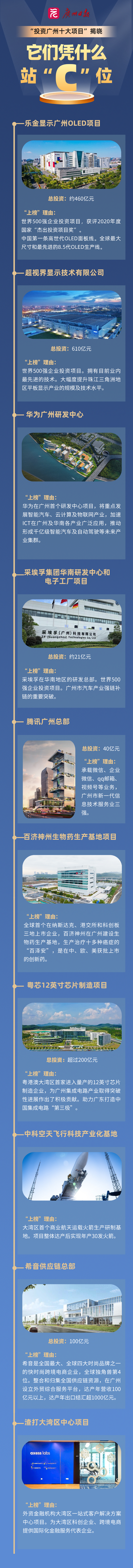 十大项目涵盖高端制造业、汽车零部件、超高清显示屏、移动互联网、航空经济、生物医药、芯片制造、跨境电商、高端金融等行业。十年来,这些项目充分印证广州产业门类的齐全和活力。