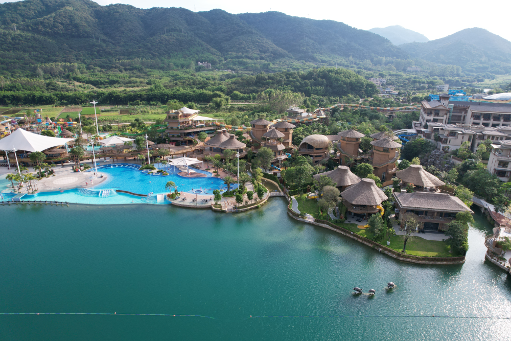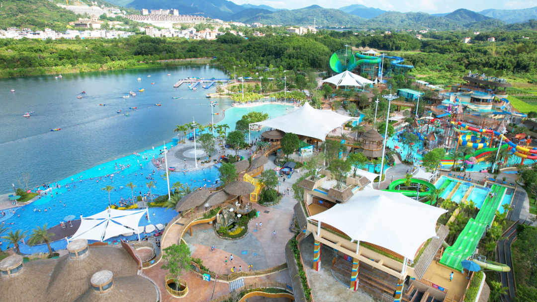 无惧天气变化,省心遛娃。作为广东唯一“室内+室外”的复合型水乐园,嬉水乐园依托温泉资源和天阳湖提供了室内+室外玩水、温泉养生、湖上游船、生态抓鱼摸虾等复合型的游玩体验。另结合临湖景观,森林海嬉水乐园设计椰林沙滩和无边泳池,一家大小都能玩。