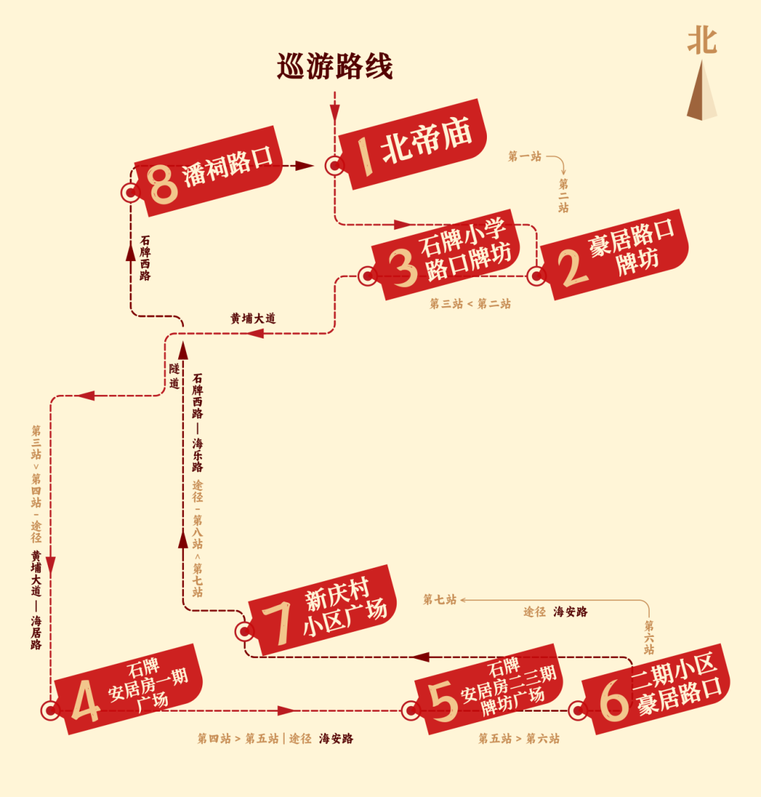 巡游具体路线为:天河区石牌村北帝庙-豪居路口牌坊-石牌小学路口牌坊-石牌安居房一期广场-石牌安居房二三期牌坊广场-二期小区豪居路口-新庆村小区广场-潘祠路口。