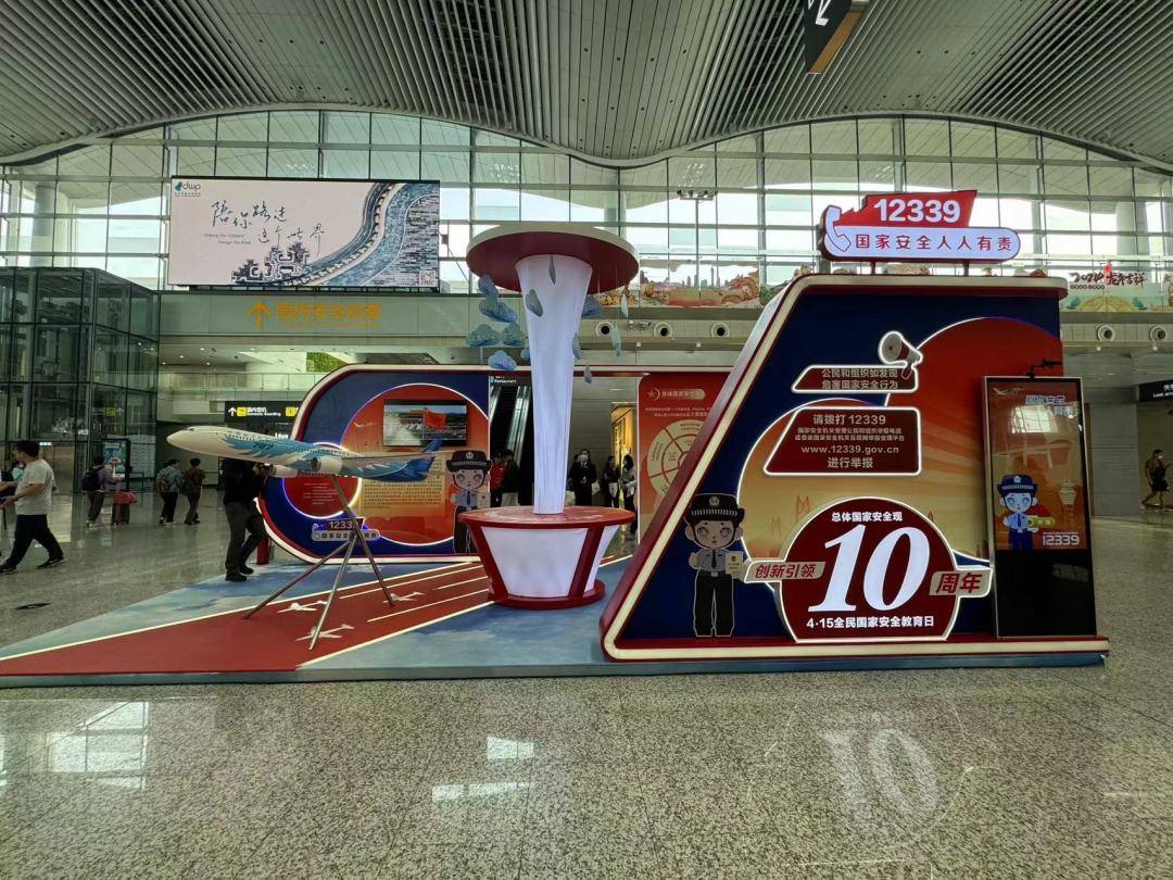 值得一提的是,在“国安号”主题航班启动仪式现场,一处主题航班宣传微展览格外吸引眼球,精美的展陈布置、酷炫的飞机模型引得路人纷纷拍照打卡。市民陈女士赞道,“打卡点设置很精美,既可以通过打卡点拍照记录在机场乘机的时刻,又可以在照片上通过AI生成国家安全宣传标语,感觉特别有意义。”