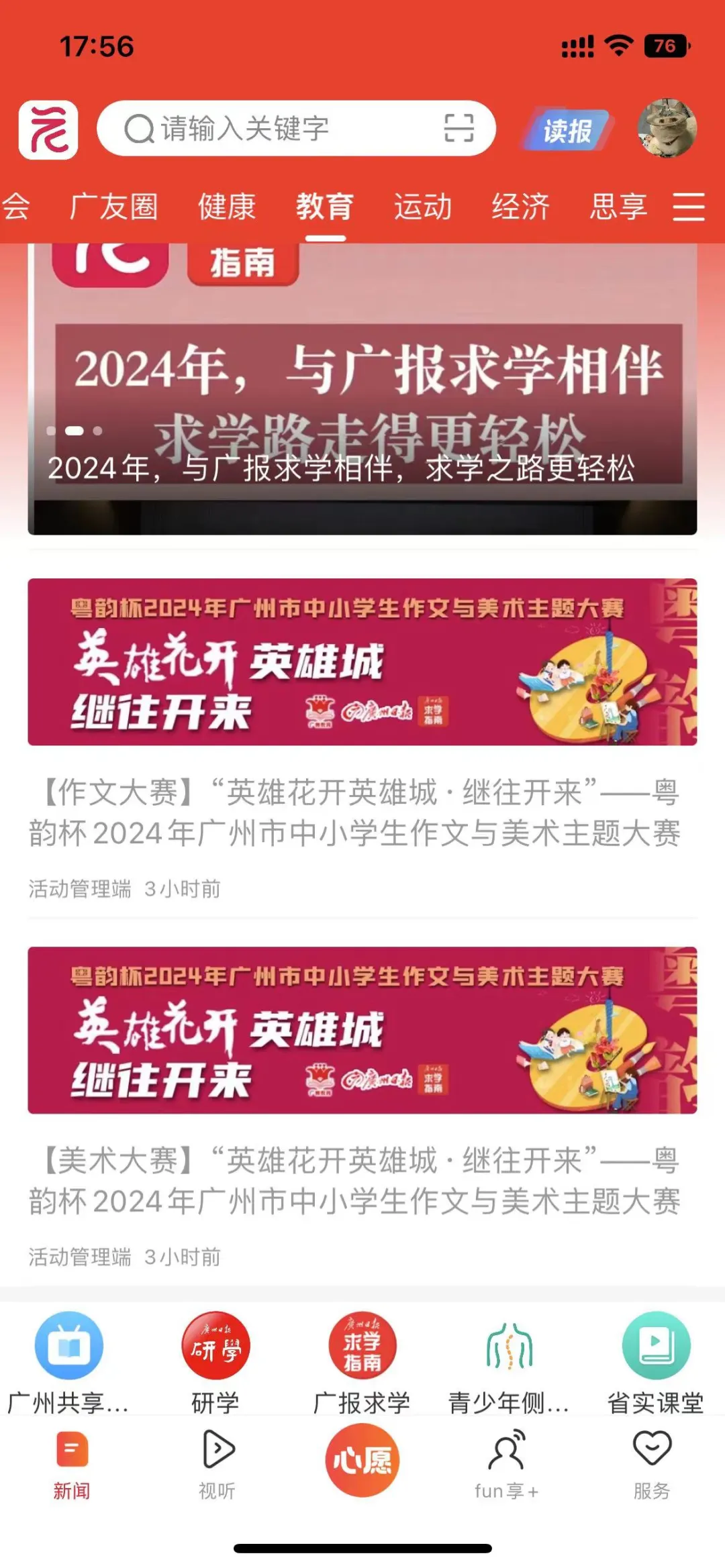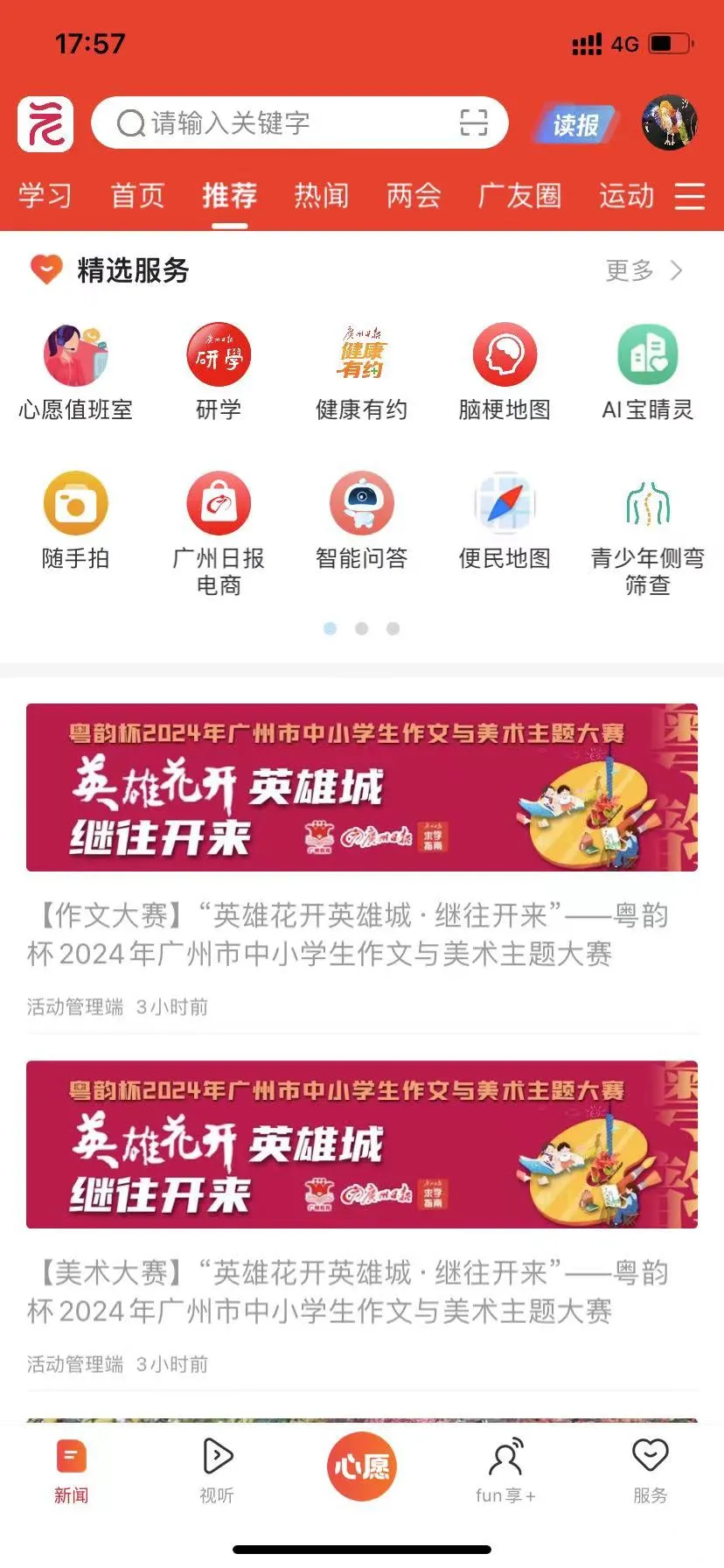 进入“广州日报新花城”客户端推荐页或“教育”频道,即可看到粤韵杯报名参与链接。