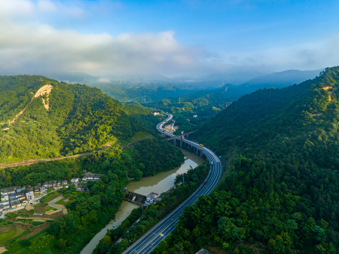 汕梅高速改扩建项目沿着山谷走廊带修建,桥梁和隧道占比高,沿线高边坡共93处,地形地貌复杂,绿色公路建设难度大。