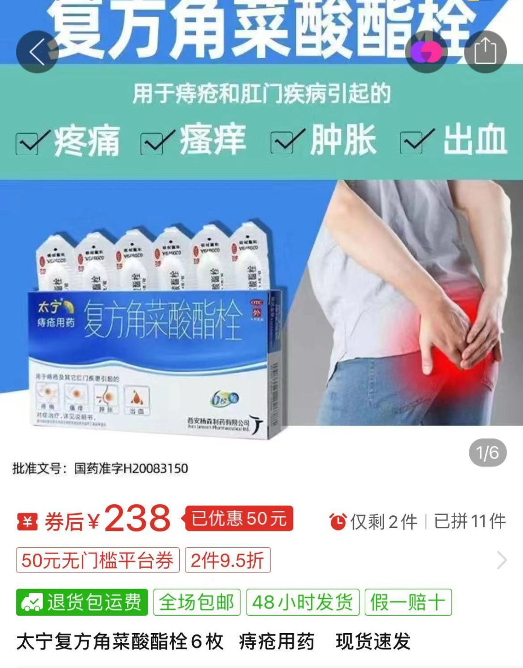 某电商平台显示,太宁栓(6枚)的价格普遍在200元左右,12枚规格的价格普遍在400元左右。而据中国医药信息查询平台2023年3月发布的信息,太宁栓(通用名:复方角菜酸酯栓)的市场价格大概在数十元不等。