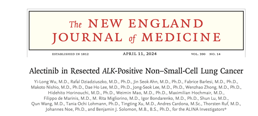 吴一龙教授牵头开展的这项国际多中心 III 期随机对照临床试验,属于全球该领域首次成功探索,为患者术后辅助治疗提供了强有力的高质量研究数据,因此《LBA2 ALINA: 早期ALK+NSCLC患者中比较阿来替尼与化疗作为辅助治疗的有效性和安全性》登上《新英格兰医学杂志》,全球业界评价“研究为早期ALK阳性肺癌术后辅助治疗带来一项新标杆”,将改写全球肺癌诊治指南。