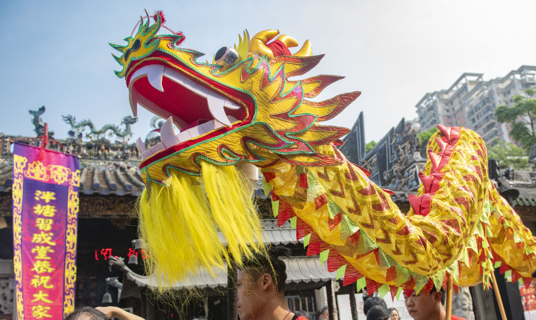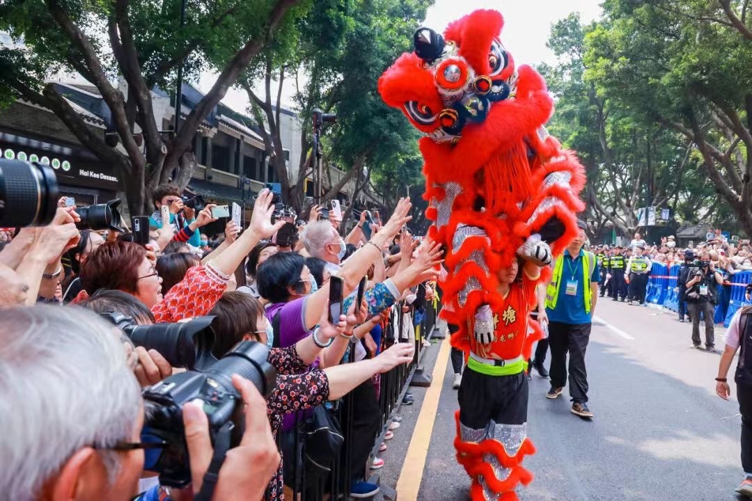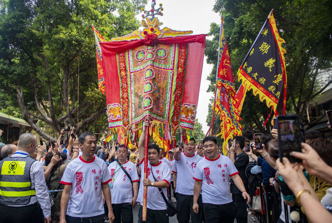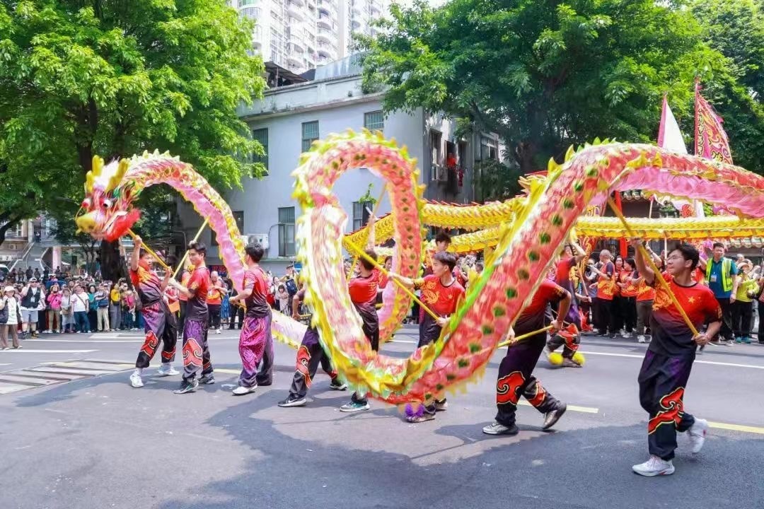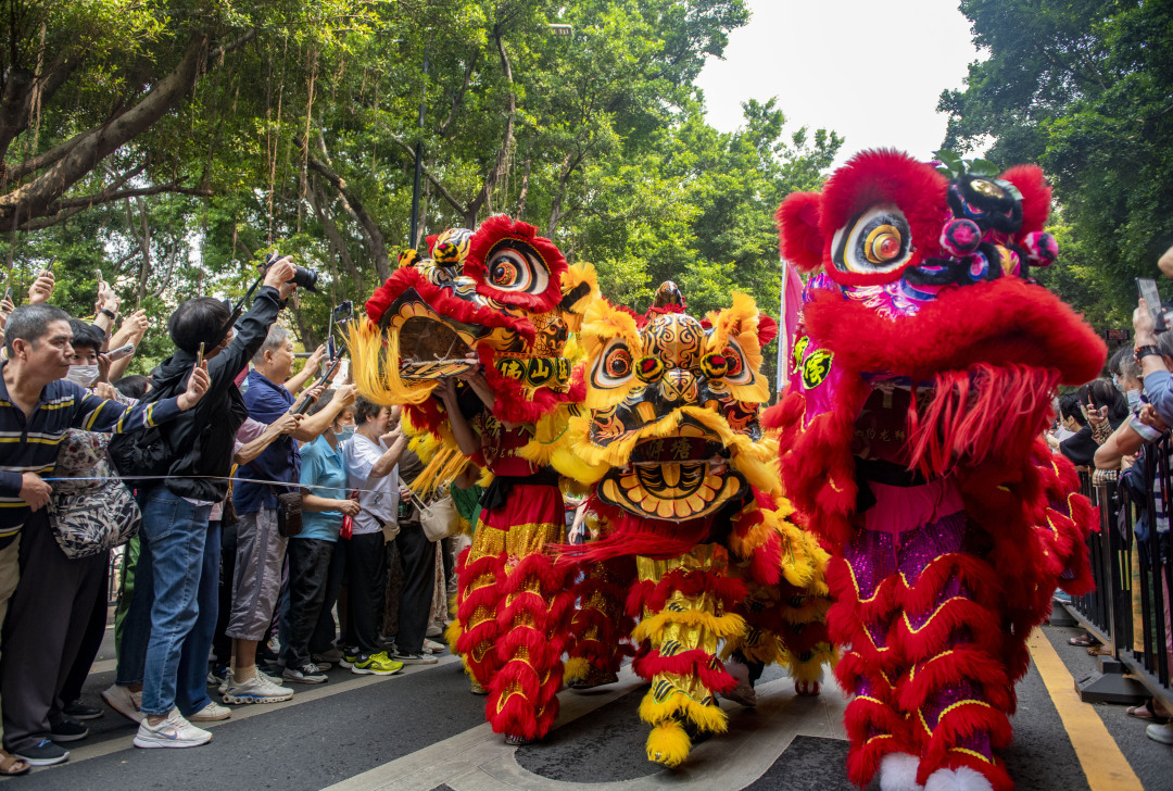 巡游成了一场露天的民俗风情展示盛宴。打头的泮塘醒狮队伍自不必说,拥有约900年历史的泮塘村保留着原汁原味的岭南文化,北帝诞、扒龙船、醒狮等民俗文化至今生生不息。村内有以狮会友的传统,每逢重大节庆,村民都会敲响锣鼓,舞起醒狮、彩龙来庆祝。