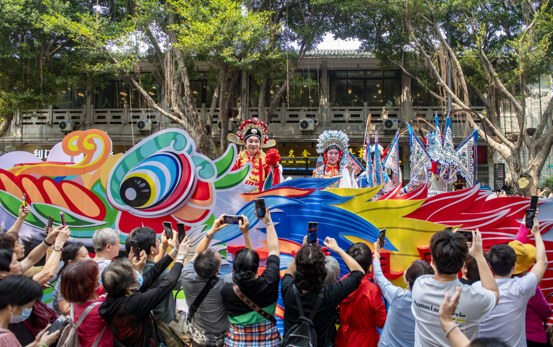 粤剧群英队伍是岭南文化的典型代表,粤剧原有末、生、旦、净、丑、外、小夫、贴、杂等十大行当,后精简为文武生、小生、正印花旦、二帮花旦、丑生、武生六大类。英气十足的粤剧武生和美艳如花的粤剧花旦频频向市民游客招手互动。