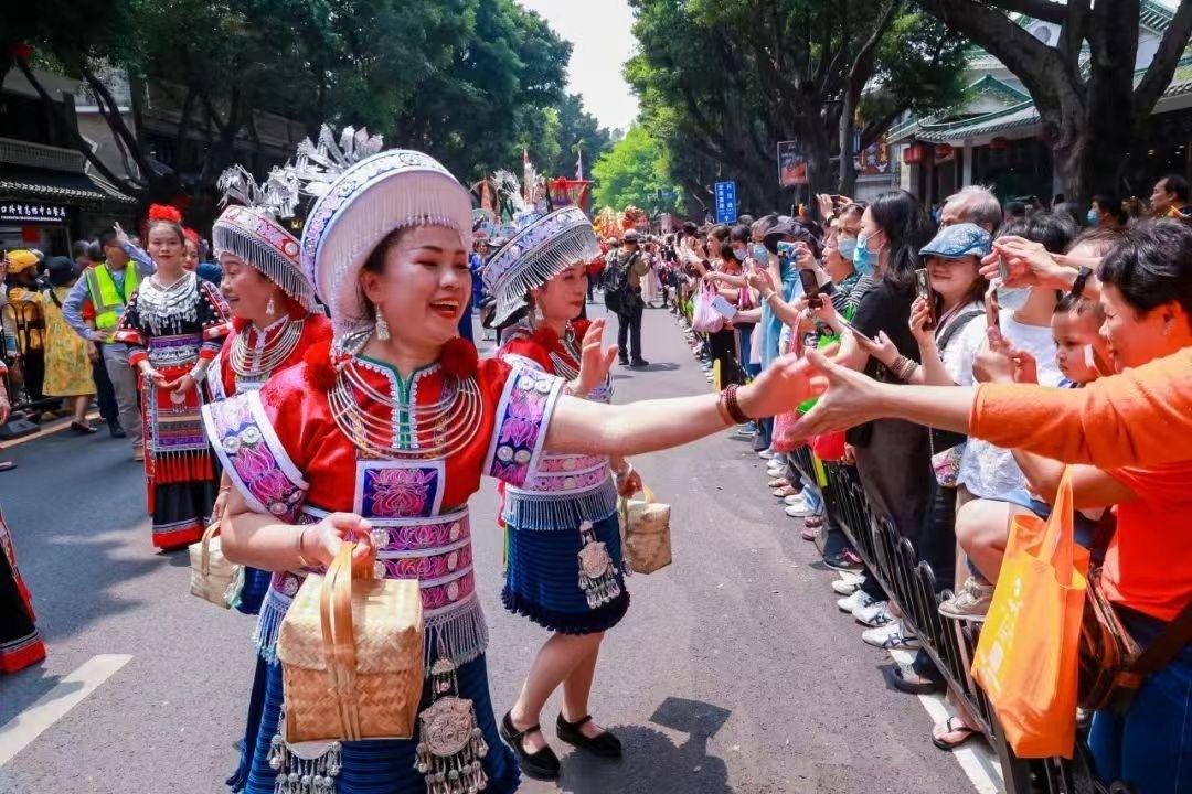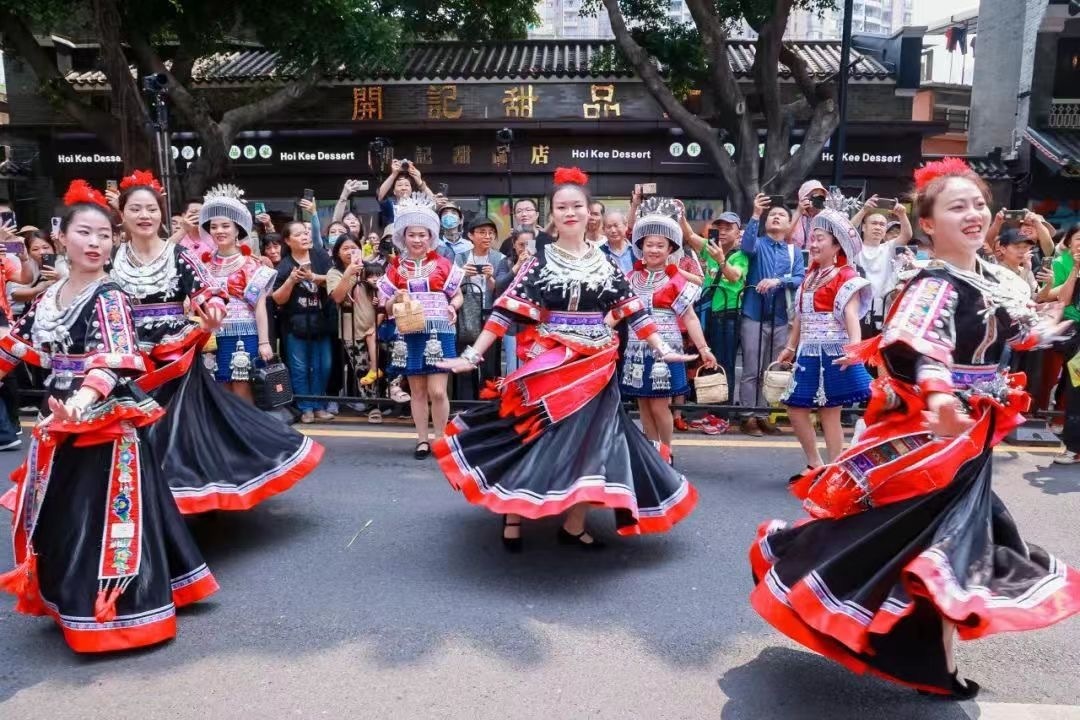 贵州惠水与梅州梅江是荔湾区对口帮扶乡村振兴的兄弟县,此次他们一道来荔湾参与盛大的“三月三”活动。惠水方阵展现了别具一格的苗族芦笙、布依民歌、国家级非遗枫香染和布依服饰等艺术珍品;国家历史文化名城梅江将客家文化带来荔湾,在巡游中尽情展现大襟衫、对襟衫、琵琶襟衫、长袍等特色客家服饰……