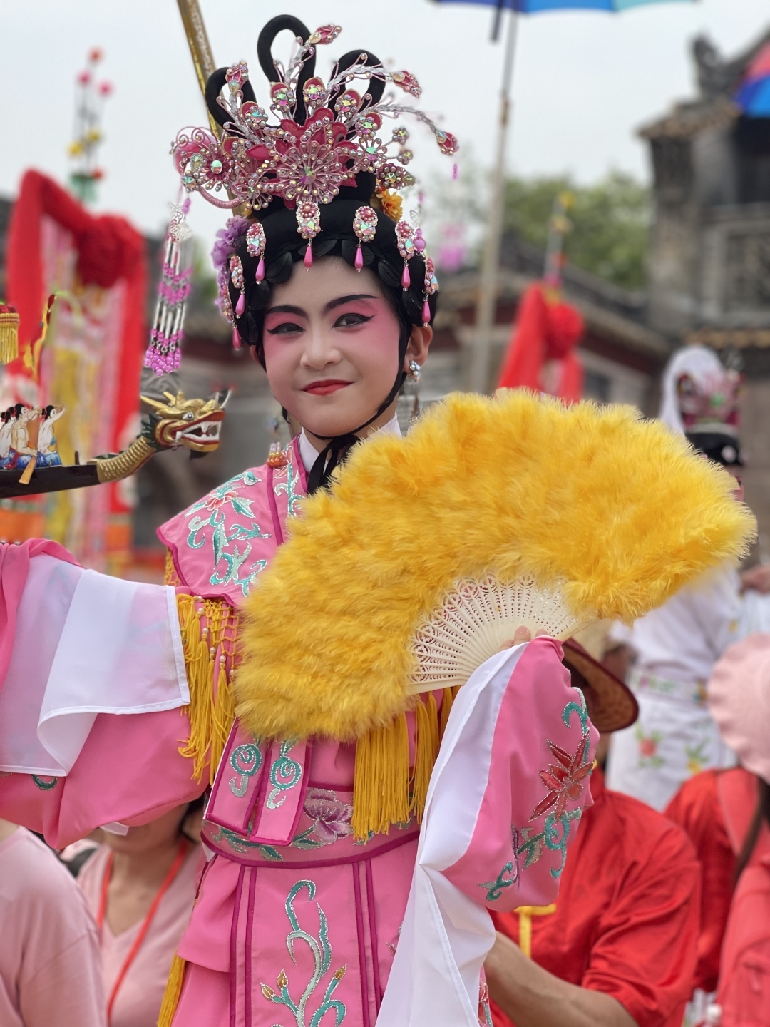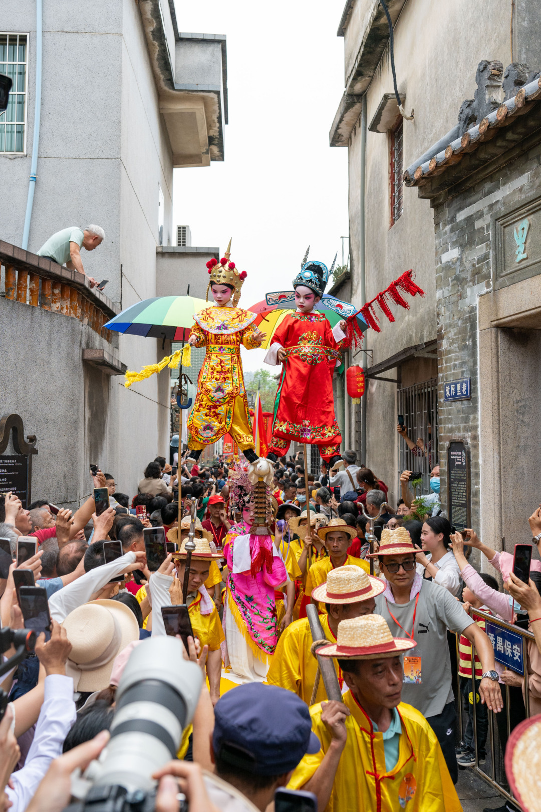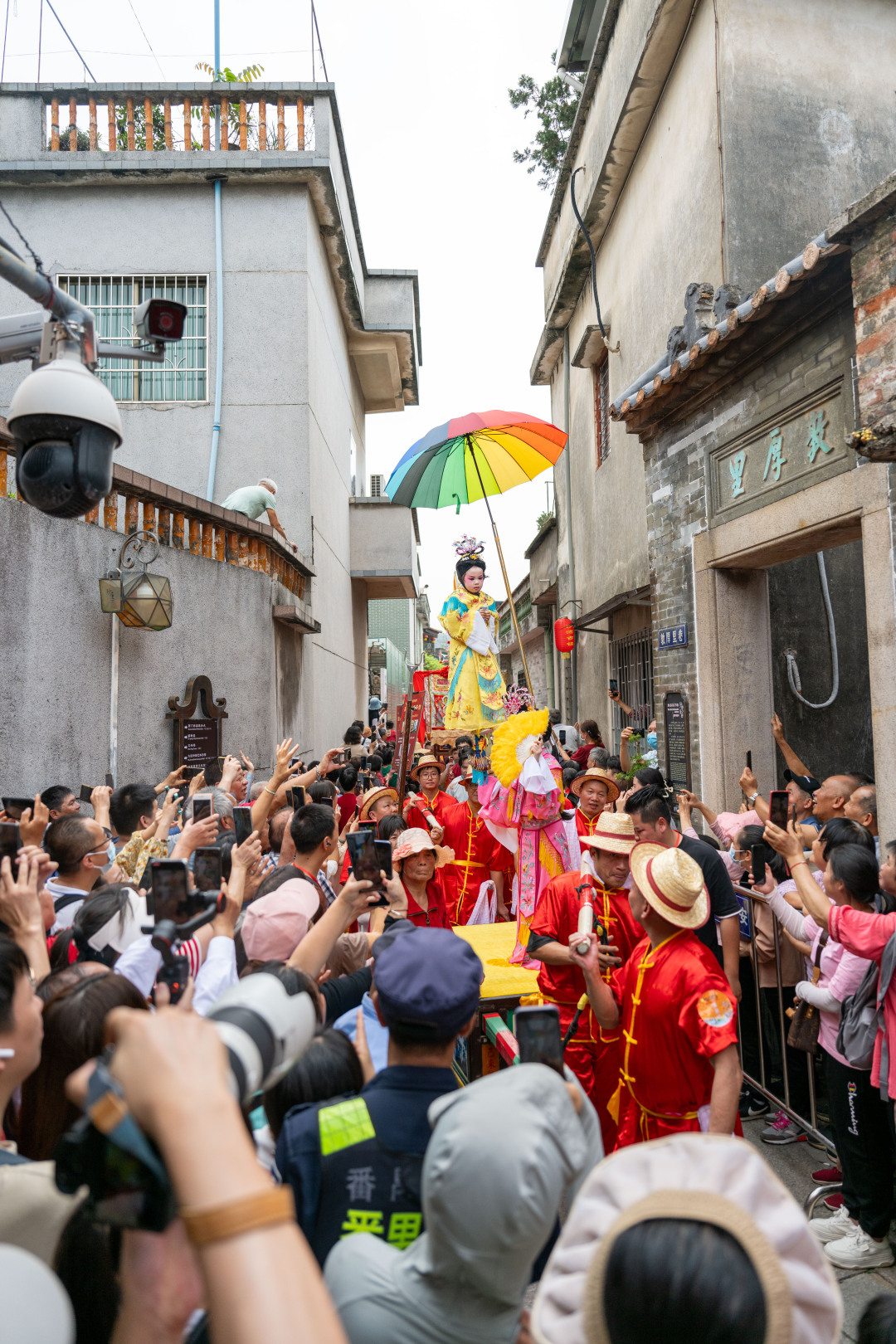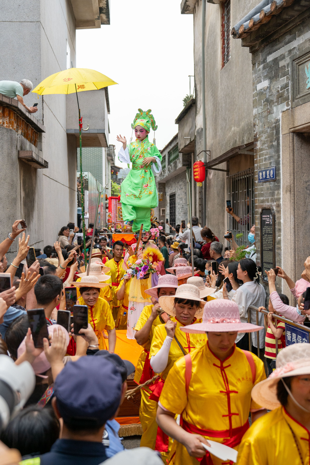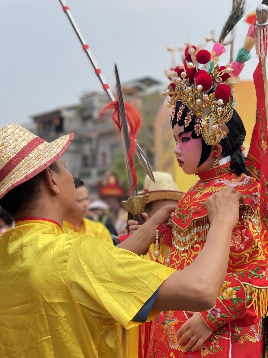在巡游的队伍中,只见“色仔”“色女”们化着精致的妆容、身着华丽的服饰,扮演着不同的神话人物角色,高高“悬”在空中,最为引人注目。