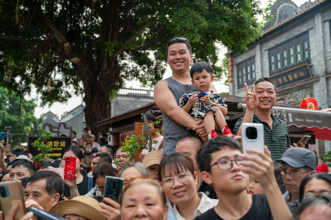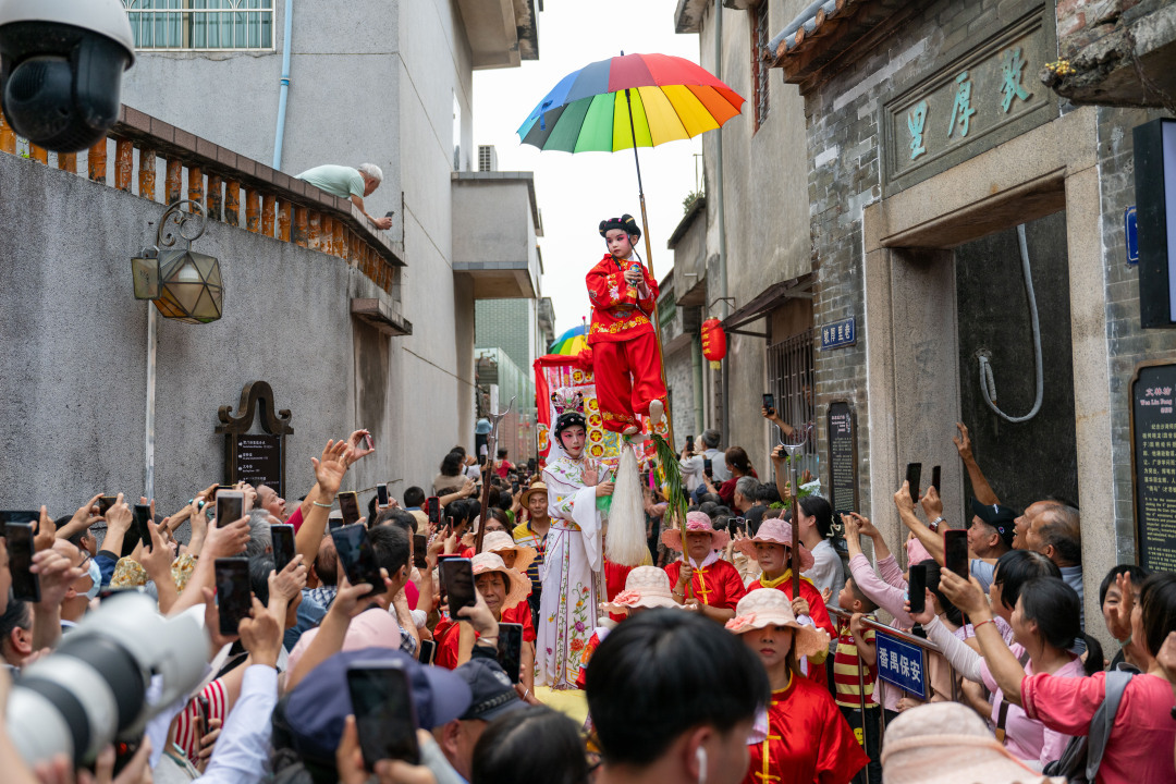 街坊王阿姨说:“我们是午饭后赶来的,亲戚朋友听说后都想来一睹盛况,我们很早就过来占了位置了。”谈到对飘色巡游的感受,她说:“这是我们沙湾‘三月三’一项精彩民俗节目,浓缩展示了古老沙湾文化。看到很多游客从广州各地专程来观赏飘色,街巷人山人海,我们感到很自豪,也感受到了文化传承的魅力。”
