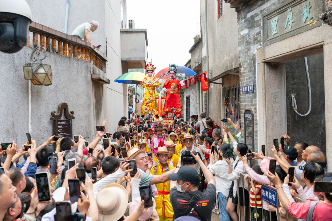 记者现场看到,巡游路线两旁站满了围观群众,大家热情高涨,纷纷拿出手机拍摄,还有一些街坊占据“高位”视角,站在楼顶露台上观赏飘色。