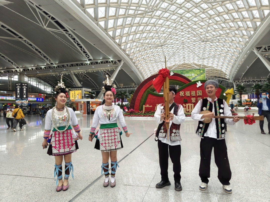 欢快的侗族大歌、载歌载舞的少数民族“阿哥”“阿妹”……4月11日,广州南站出发大厅里一片欢腾,“老广”们整装待发,陆续踏上前往贵州旅游的列车。由广州市文化广电旅游局指导,广州广之旅国际旅行社、广州博域国际旅行社等共同发起了2024“百万老广游贵州 —冬春行”高铁旅游推广活动正式启动,活动旨在鼓励广州市民前往美丽的贵州省,尤其是广州对口帮扶的毕节、黔南、安顺三个地区旅游,享受赏花和春游的乐趣,同时通过游客在当地进行餐饮、住宿、交通、娱乐和购物等消费,带动当地文旅经济。
