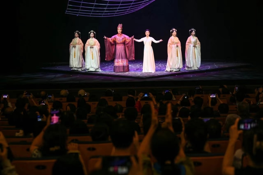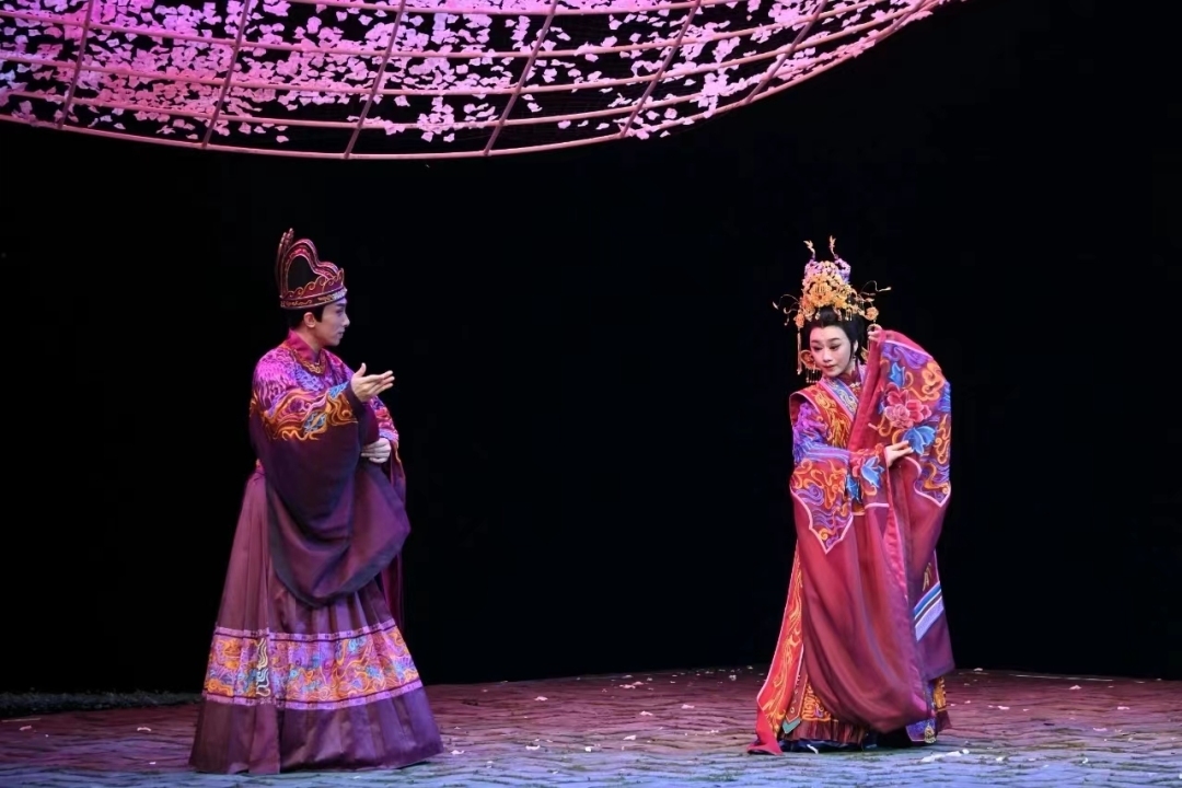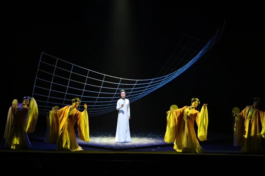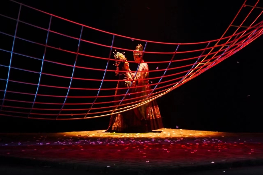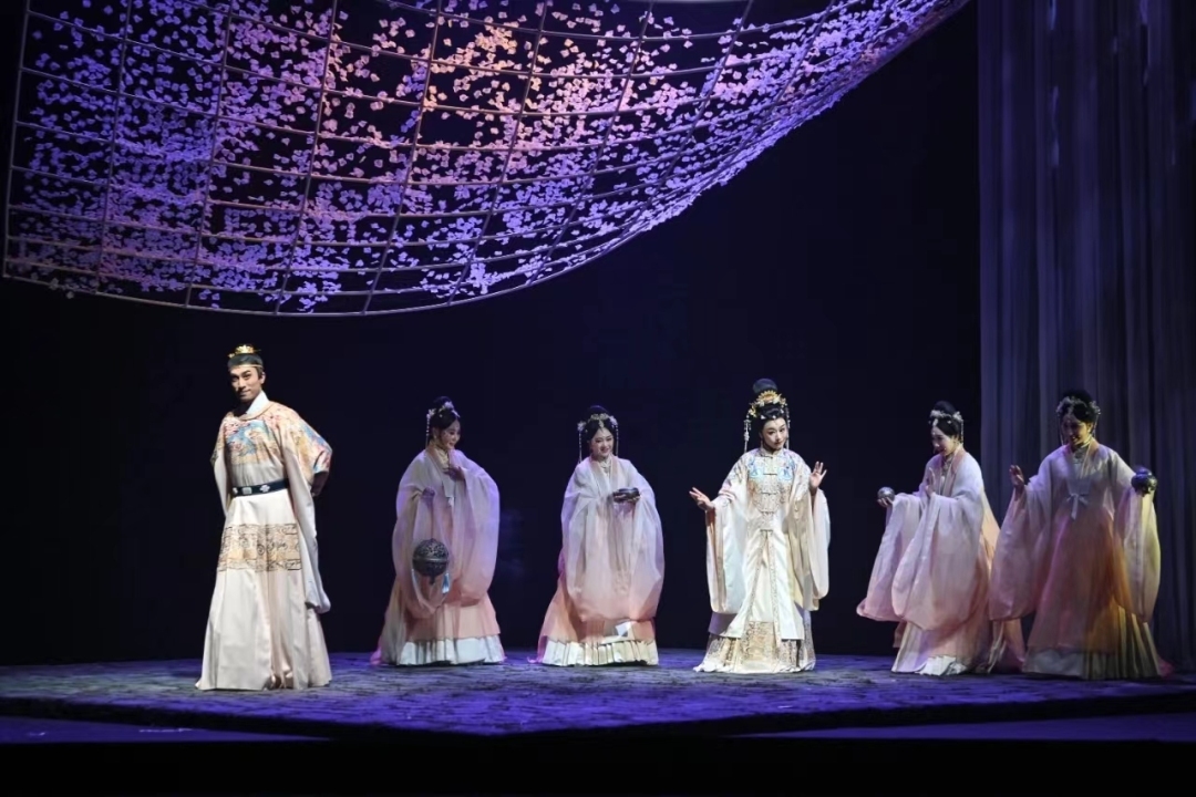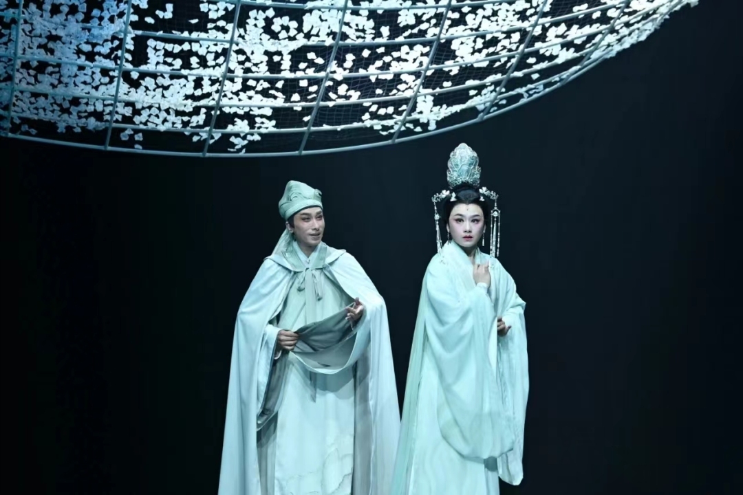 “爱从树底生,死由树合殓。不负树中盟,生死共含樟。”舞台上,四侍女深情吟唱,将长平公主与周世显共镌长情、同心殉国的壮美爱情展现得唯美动人。