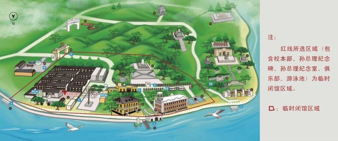 临时闭馆区域为:黄埔区长洲岛军校路170号大院内各史迹点,包含校本部、孙总理纪念室、孙总理纪念碑、俱乐部、游泳池。