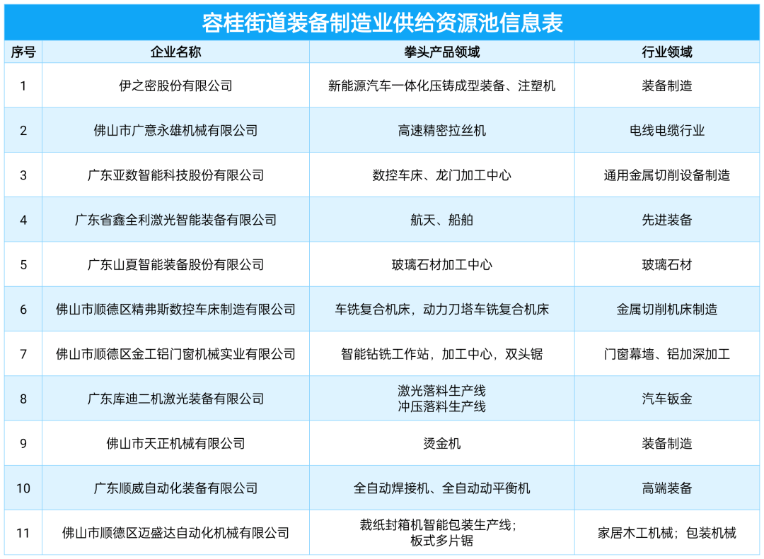 值得注意的是,容桂根据企业的营收状况、拳头产品、行业领域等进行规范遴选,率先发布本土装备制造业供给资源池。其中,伊之密股份有限公司、佛山市广意永雄机械有限公司、广东亚数智能科技股份有限公司等11家企业入选,还配套五大措施扶持企业发展,确保政策“红利”充分惠及企业,搭建起“内循环”平台,为企业设备更新提供指引。