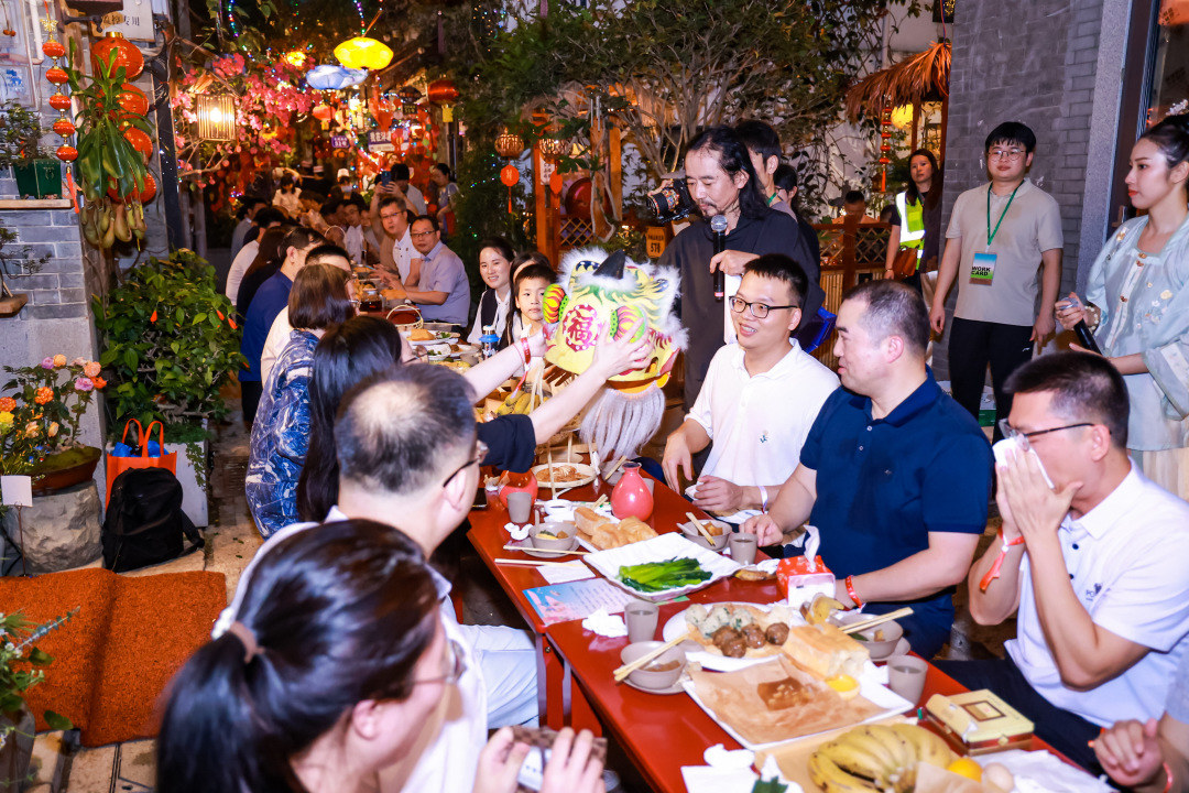 4月12日傍晚,华灯初上,位于广州荔湾湖畔的泮塘古村张灯结彩,洋溢着春天的气息。今年“三月三·荔枝湾”——上巳春归长桌宴活动延续以往的泮塘长桌宴风俗习惯,在泮塘五约直街铺设近百米的长桌宴空间,沿着长长的麻石巷,街坊邻舍欢聚一堂,传承“聚宗亲,商族事,祈丰收,保平安”的传统风俗。