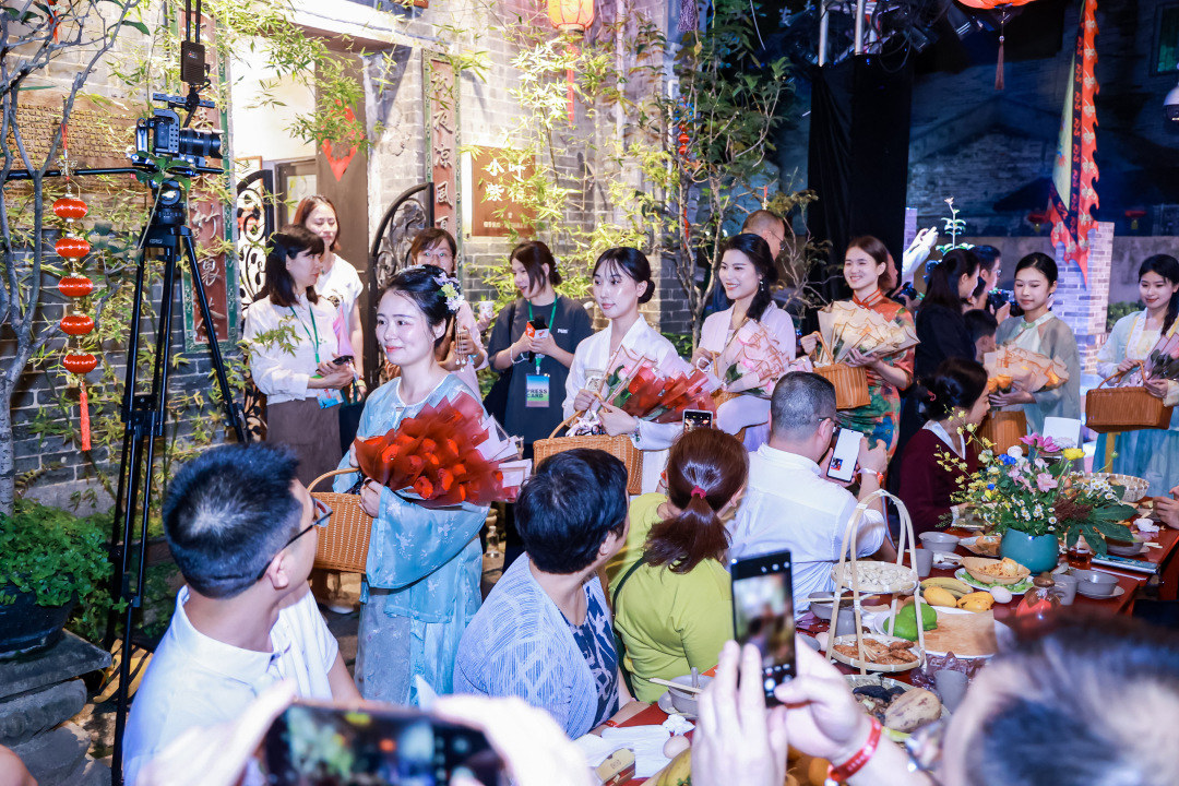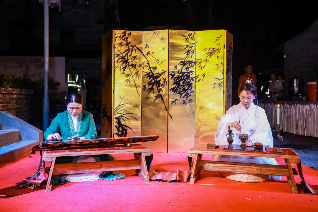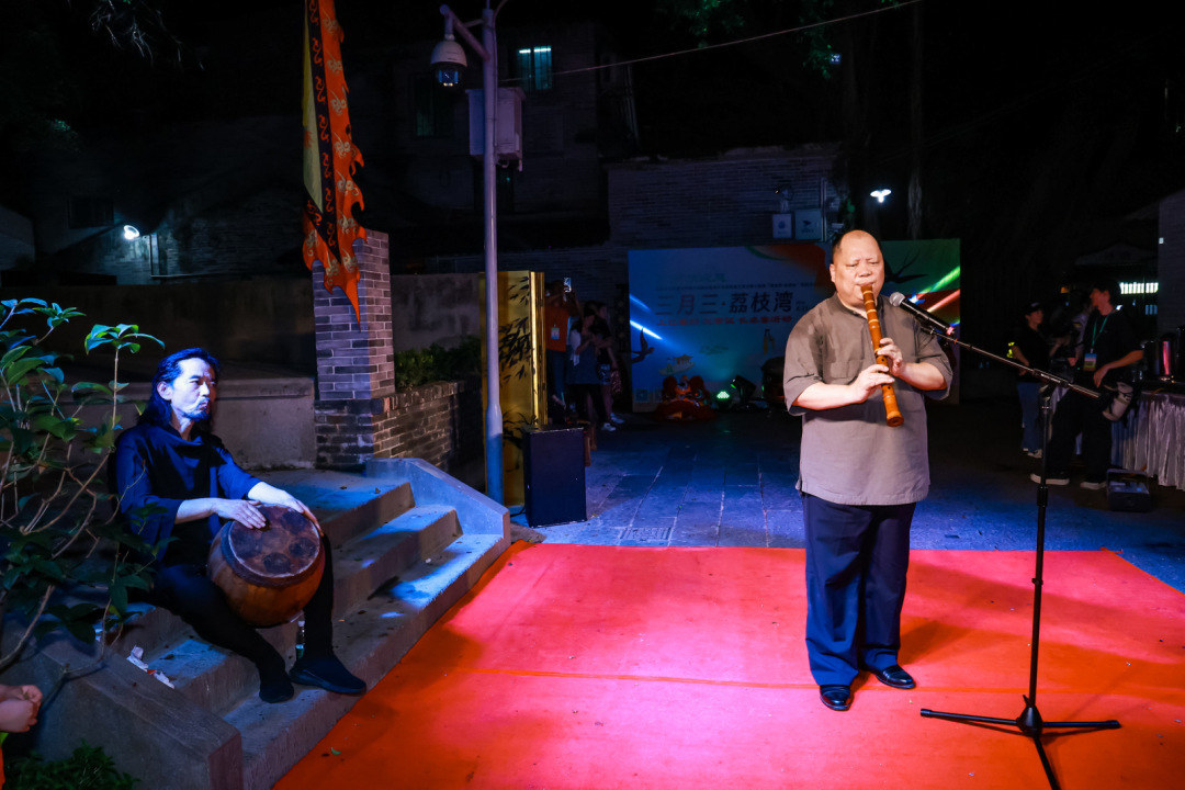 随着悠扬的古乐声响起,身着汉服的舞者翩翩起舞,为观众带来了一场“祓禊畔浴”的古老习俗表演。随后,岭南香道、广东音乐、肩上芭蕾、近身魔术、鸡公榄表演、尺八独奏、民乐表演等一场场传统与现代碰撞、凸显岭南在地文化的艺术演出陆续呈现,让观众在浓厚的艺术氛围中沉浸式感受古村烟火。