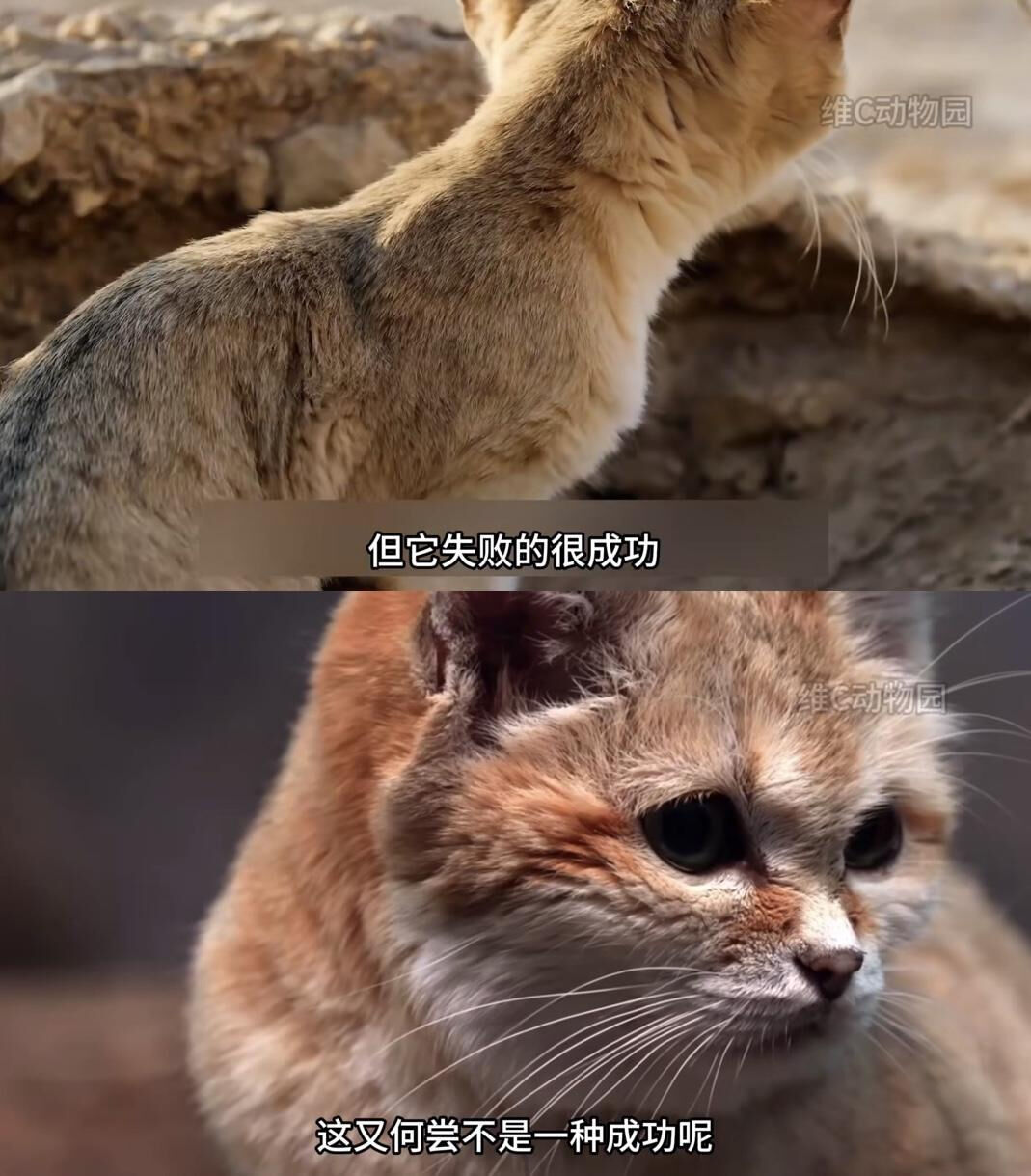 面对腿短肉多易捕捉的砂角蜥,沙猫悄悄地匍匐前进企图捕食,但砂角蜥转身一溜就钻进了沙漠里,此次猎捕行为成功失败。维C点评道:虽然成功的失败了,但它失败的很成功,这又何尝不是一种成功呢?